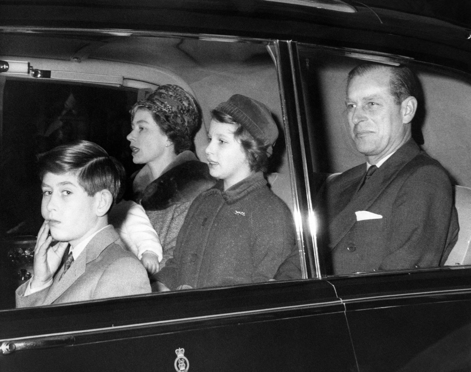 Ratu Elizabeth, Pangeran Philip, serta anak-anak mereka, Pangeran Charles, Putri Anne, dan Andrew, difoto di luar Liverpool Street Station di London, dari mana mereka akan naik kereta menuju Sandringham menjelang liburan Natal.