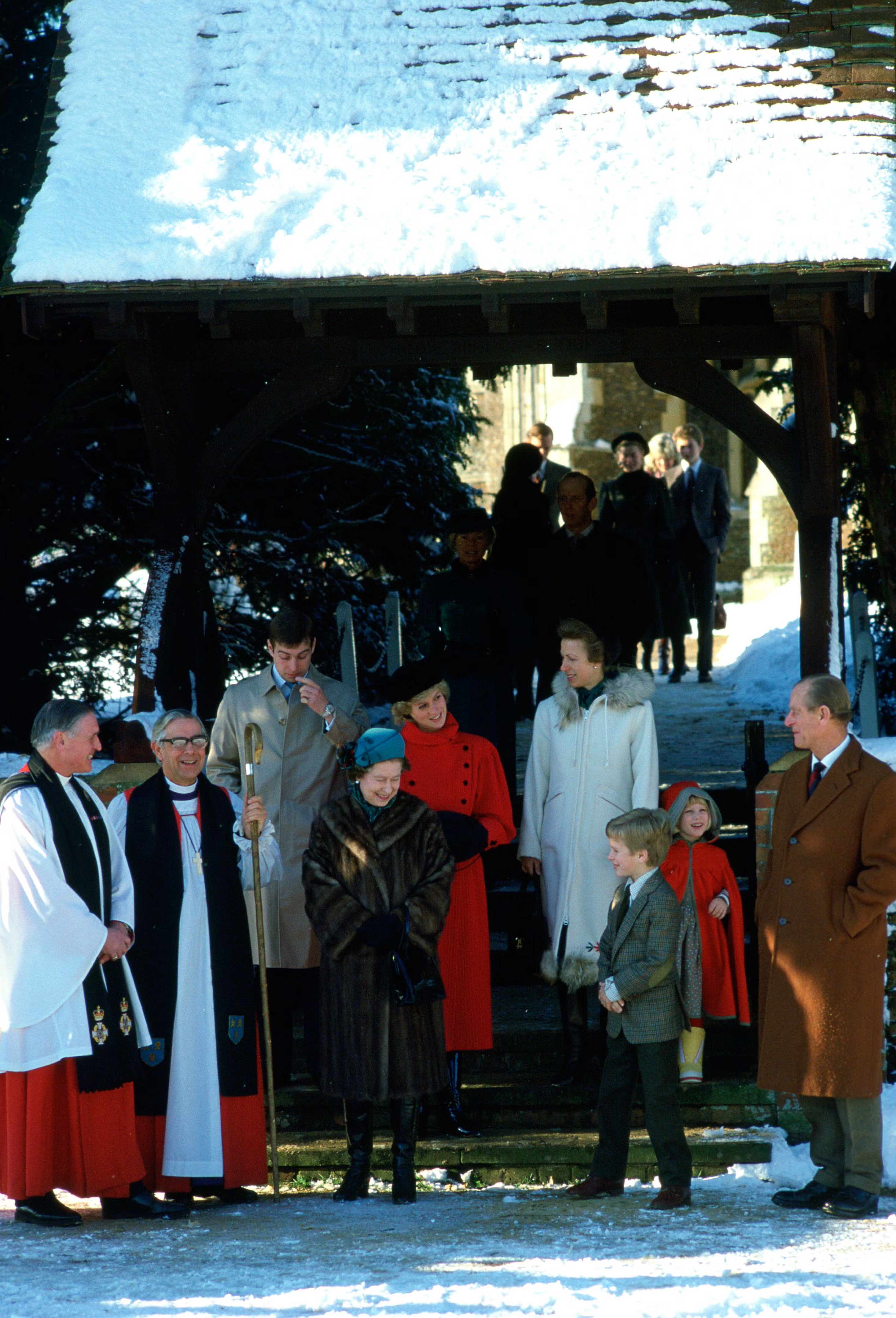 Ratu Elizabeth II, Pangeran Philip, Putri Diana, Putri Anne, dan Pangeran Andrew menghadiri kebaktian Hari Natal di Sandringham.
