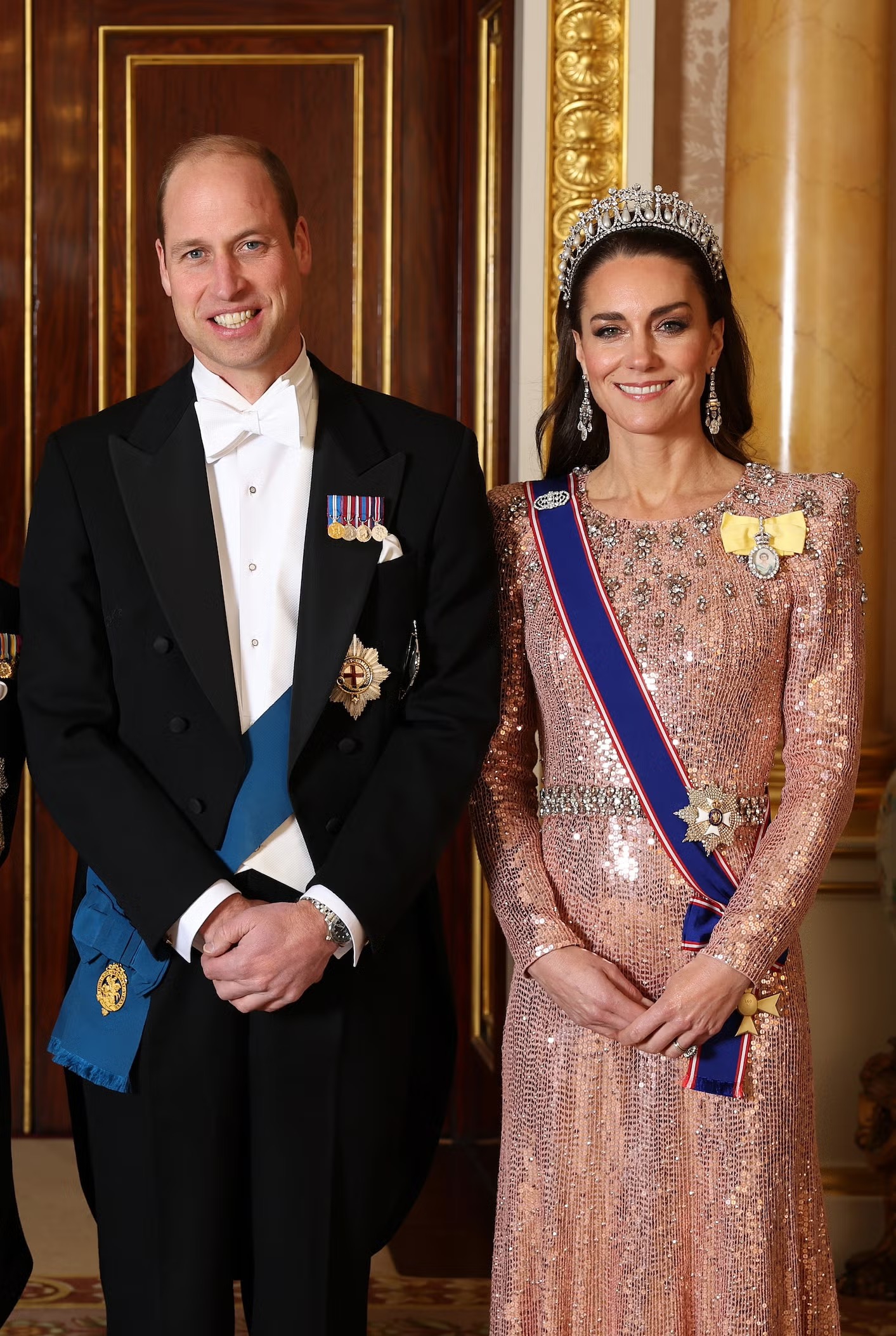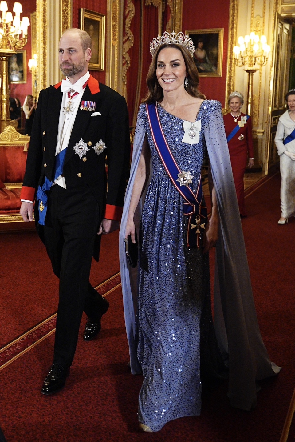 Putri Kate kembali memilih Lover’s Knot Tiara untuk jamuan kenegaraan Amerika Serikat, memadukannya dengan anting gantung safir dan berlian milik Ratu Ibu serta selempang merah muda dan biru yang melambangkan gelarnya yang baru sebagai Dame Grand Cross of the Royal Victorian Order.