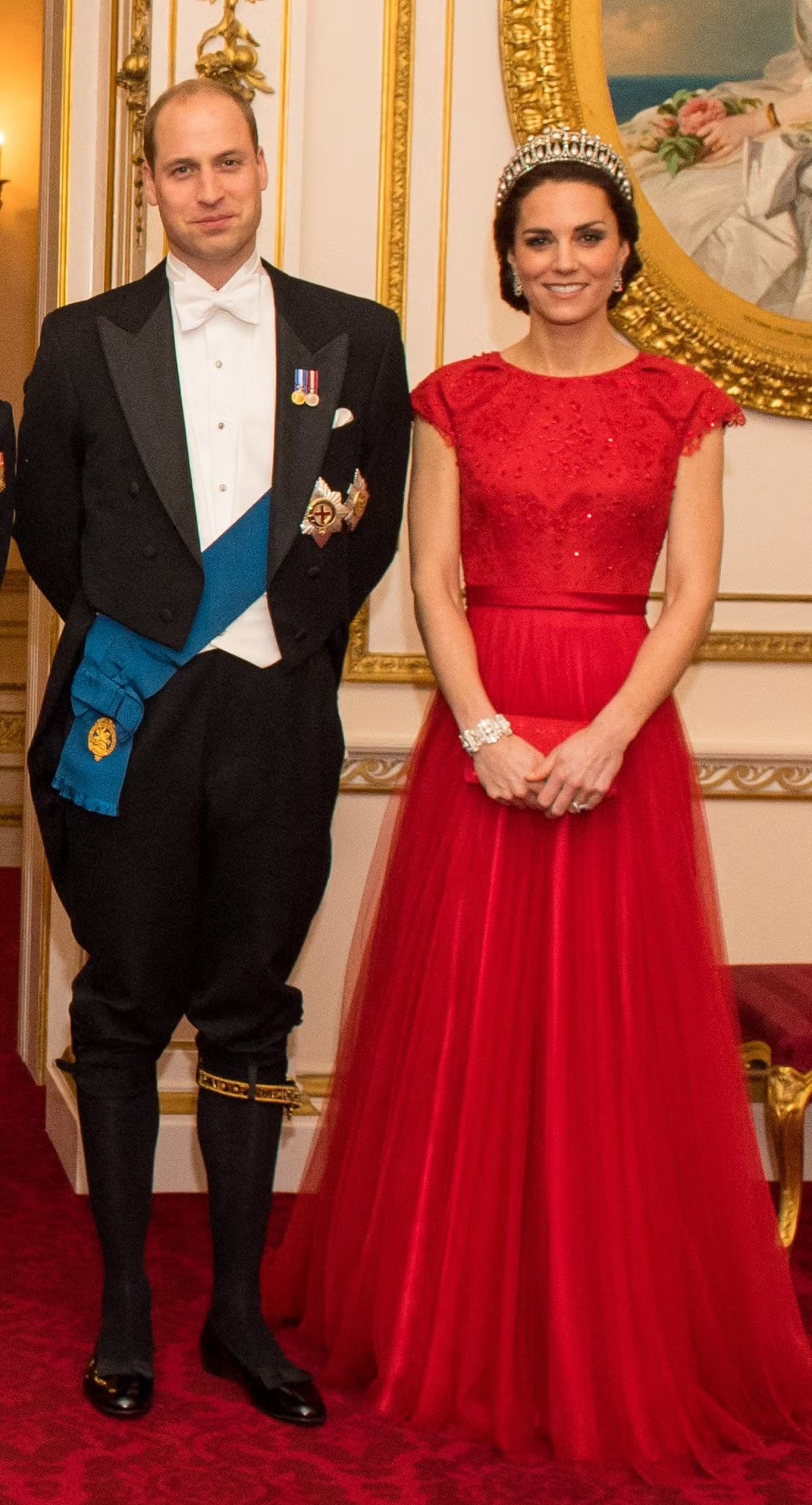 Untuk jamuan kenegaraan resmi pertamanya di Istana Buckingham, Putri Kate memilih Lotus Flower Tiara dan memadukannya dengan gaun merah dari Jenny Packham. Pada acara tersebut, ia menyambut Presiden Tiongkok Xi Jinping dan istrinya, Madame Peng Liyuan.