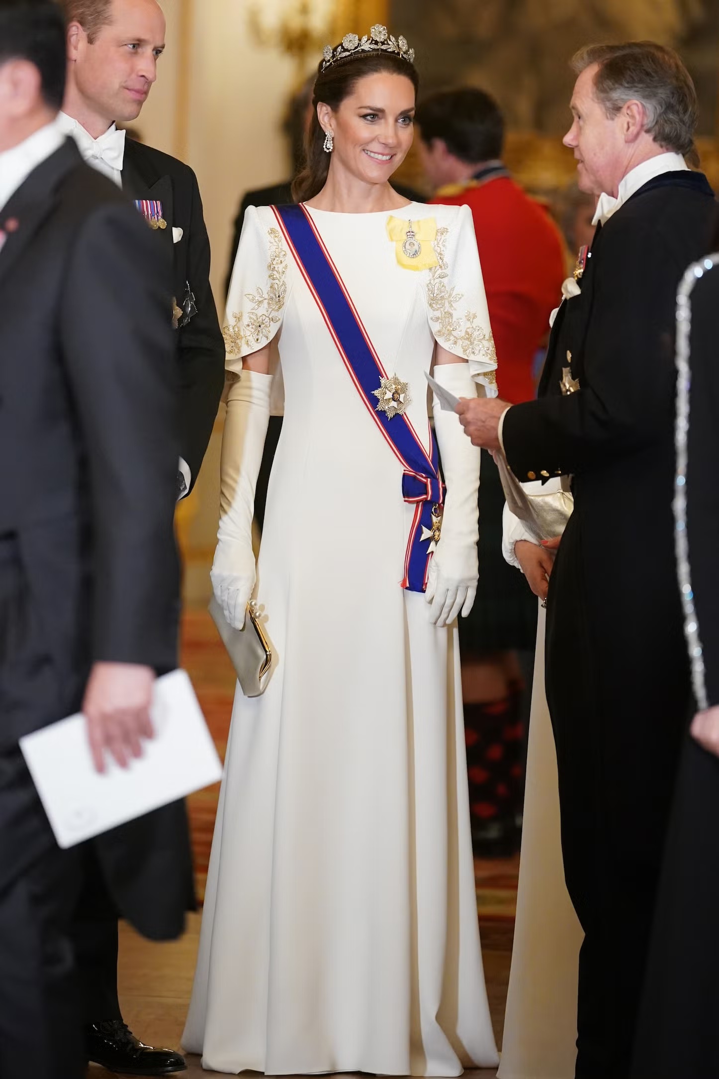 Putri Kate memadukan Lover’s Knot Tiara dengan gaun cape putih dari Jenny Packham dan anting gantung mutiara untuk jamuan kenegaraan pertama Raja Charles III sebagai monarki. Acara tersebut juga digelar untuk menghormati kunjungan Presiden Afrika Selatan, Cyril Ramaphosa, sekaligus menjadi momen pertama Putri Kate mengenakan tiara sejak menjadi Putri Wales.