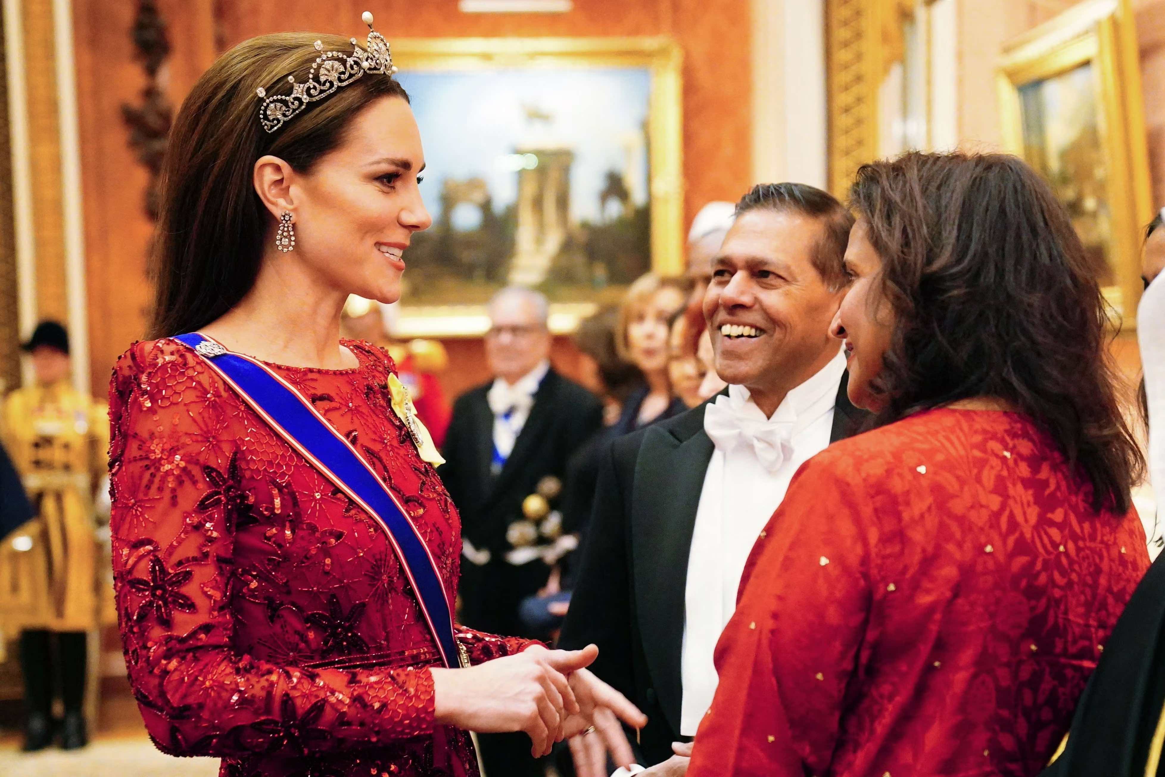 Putri Kate kembali mengenakan Lotus Flower Tiara untuk pertama kalinya sejak 2015, saat resepsi korps diplomatik di Istana Buckingham, memadukannya dengan gaun merah berkilau dari Jenny Packham.