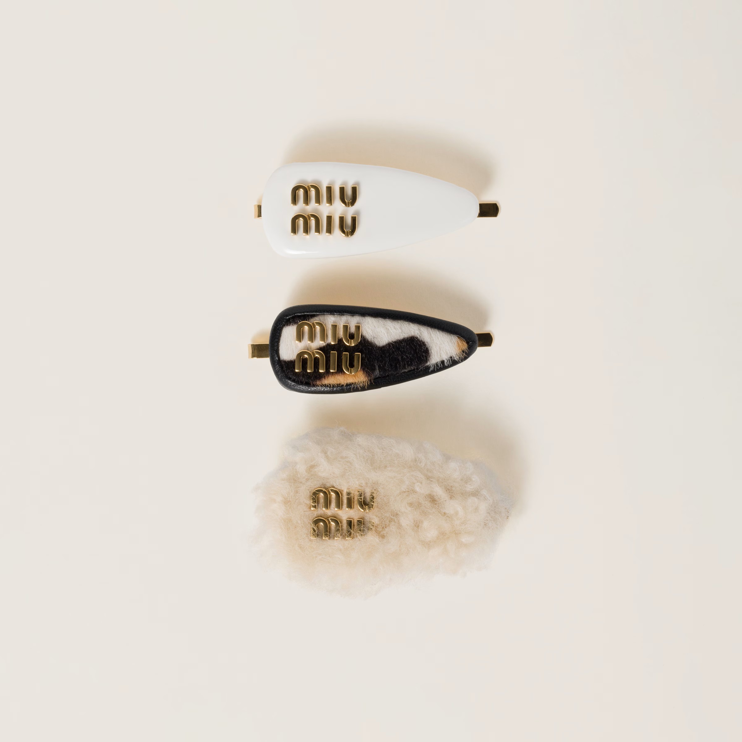 Set jepit rambut ini dibuat dengan detail yang menonjolkan estetika feminin khas Miu Miu. Ukurannya ideal untuk styling cepat tanpa meninggalkan kesan berlebihan. Aksesoris ini memberikan tambahan aksen pada tampilan harian dengan cara yang praktis.