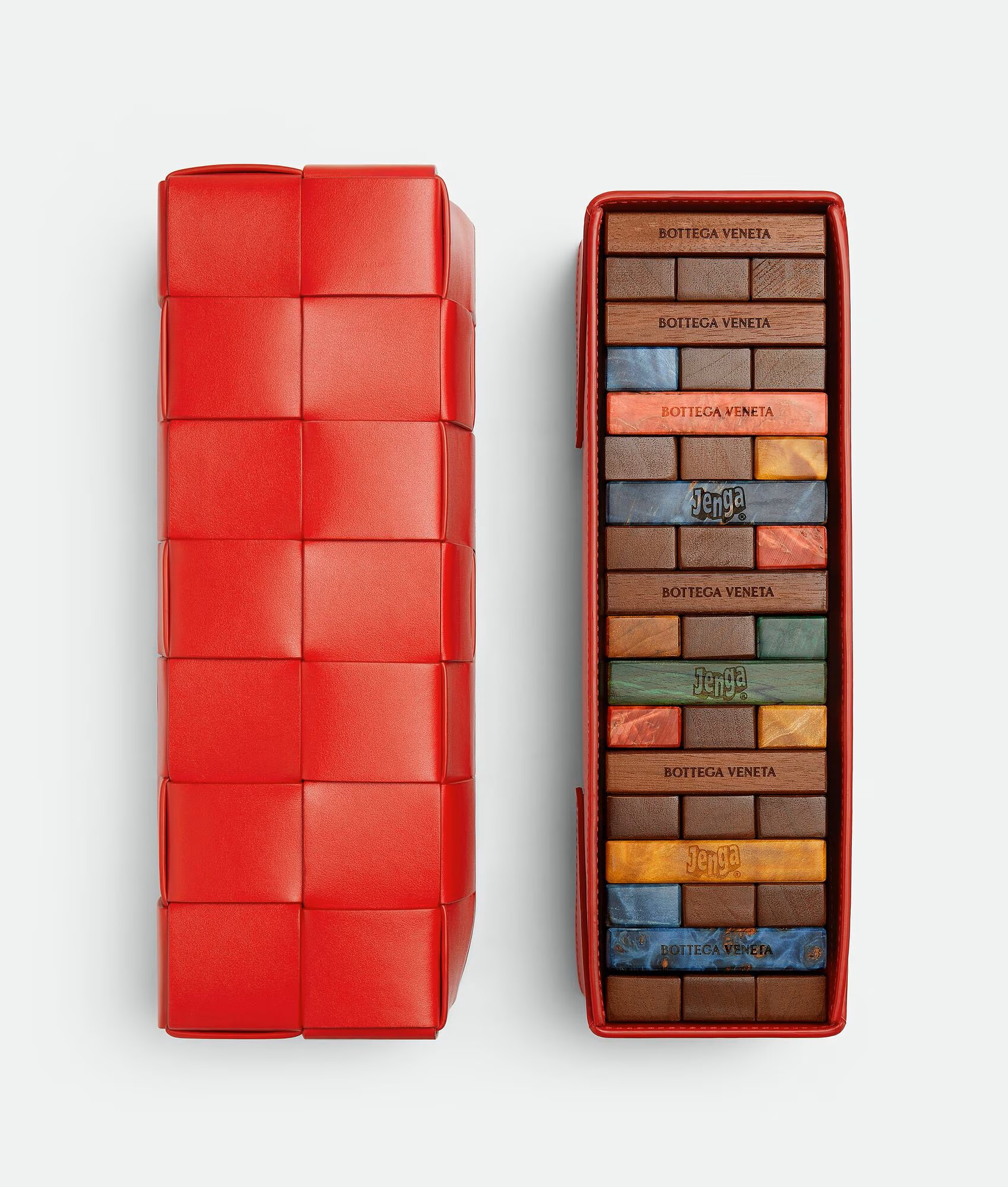 Bottega Veneta menghadirkan permainan Jenga dalam versi dekoratif dengan balok kayu berfinishing halus. Estetika desainnya menjadikan produk ini bukan hanya permainan, tetapi juga objek interior yang menarik. Kualitas craftsmanship-nya memberi nilai lebih bagi penerima yang menghargai detail dan keunikan.