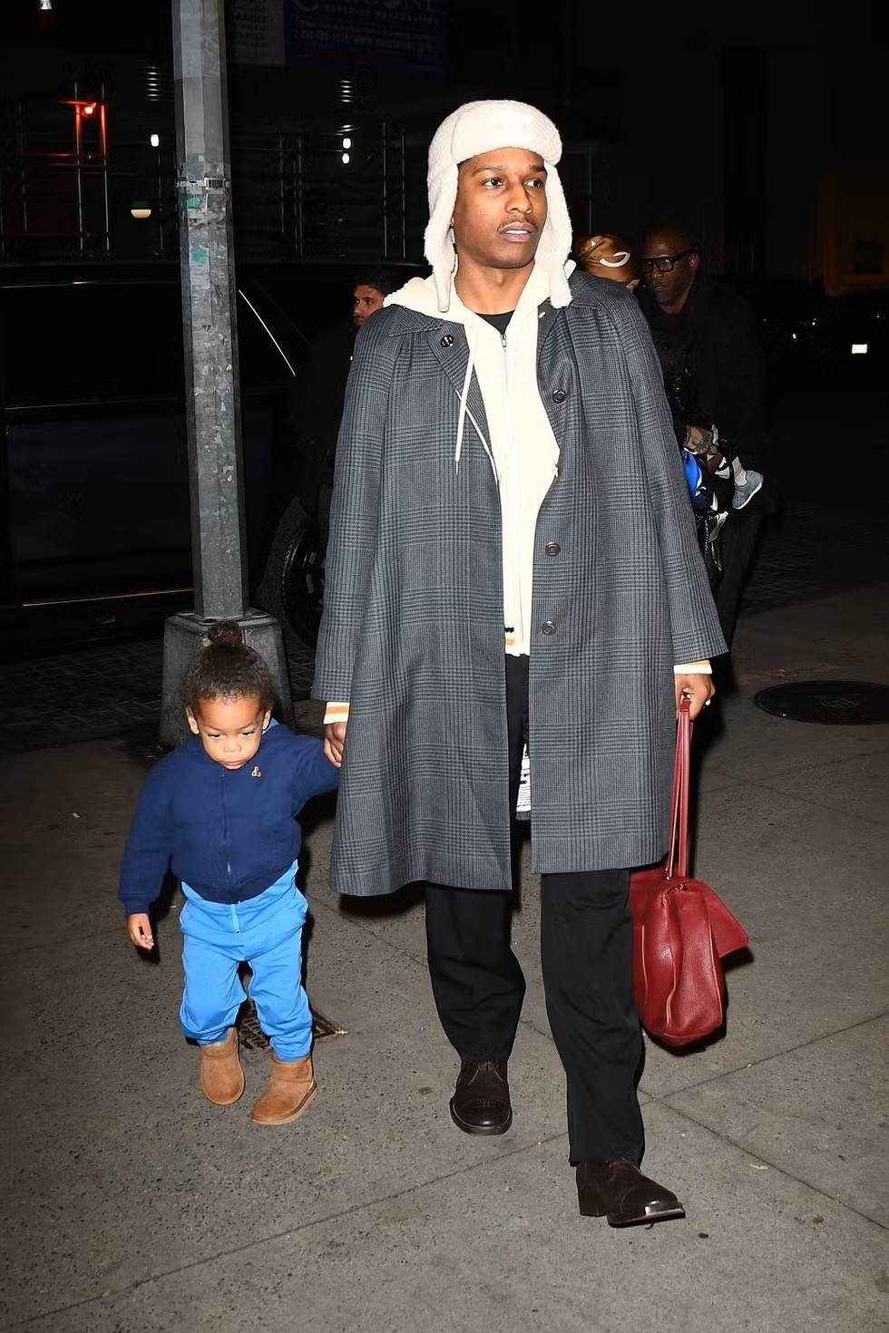 Untuk A$AP Rocky, agenda keluarga ini menjadi momen Chanel-on-Chanel—mulai dari topi rajut musim dingin, hoodie beresleting bergaya varsity, hingga sepatu loafers burgundy berhak. Ia tampil klasik dengan mantel plaid panjang dan membawa tas selempang marun di satu tangan, sementara tangan lainnya menggenggam tangan RZA.