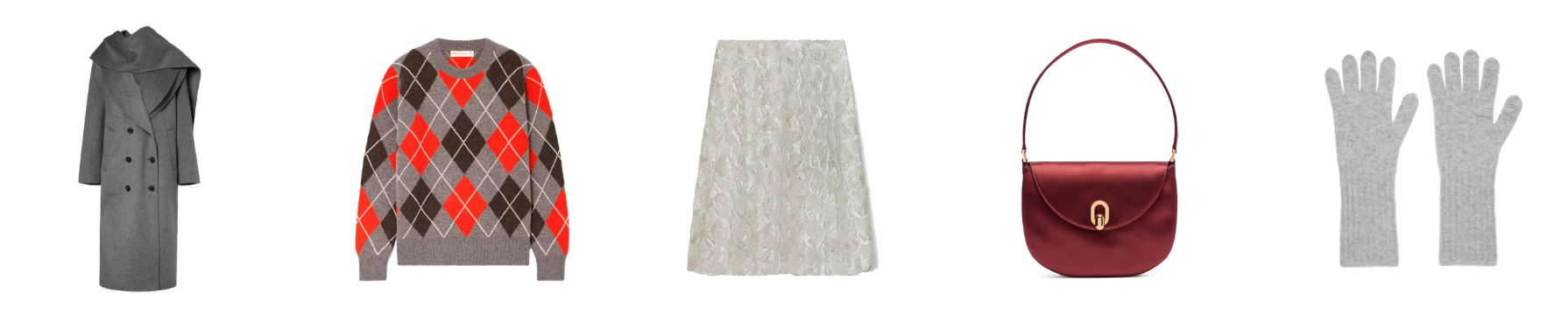 Cara mudah membuat pakaian apa pun terasa lebih meriah adalah dengan menambahkan sedikit kilau. Jika ingin efeknya tetap lembut, pilih warna dan pola yang menenangkan. Sweater argyle bernuansa abu-abu terasa cocok untuk kantor berkat nuansa preppy-nya, tetapi juga sempurna untuk suasana liburan. Coat dengan scarf bawaan, tren dari runway fall/winter 2025, memberi struktur yang tepat untuk menyeimbangkan rok payet.