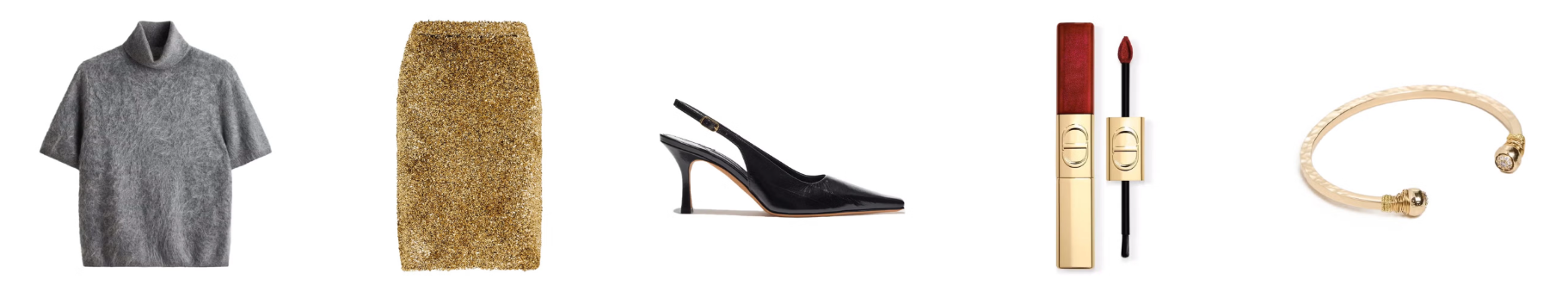Untuk pesta larut malam, jadilah pusat perhatian dengan rok pensil berumbai emas. Mainkan nuansa nostalgia dengan memasangkannya dengan turtleneck lengan pendek bergaya ’60-an, dan sempurnakan tampilan dengan lipstik merah cerah.