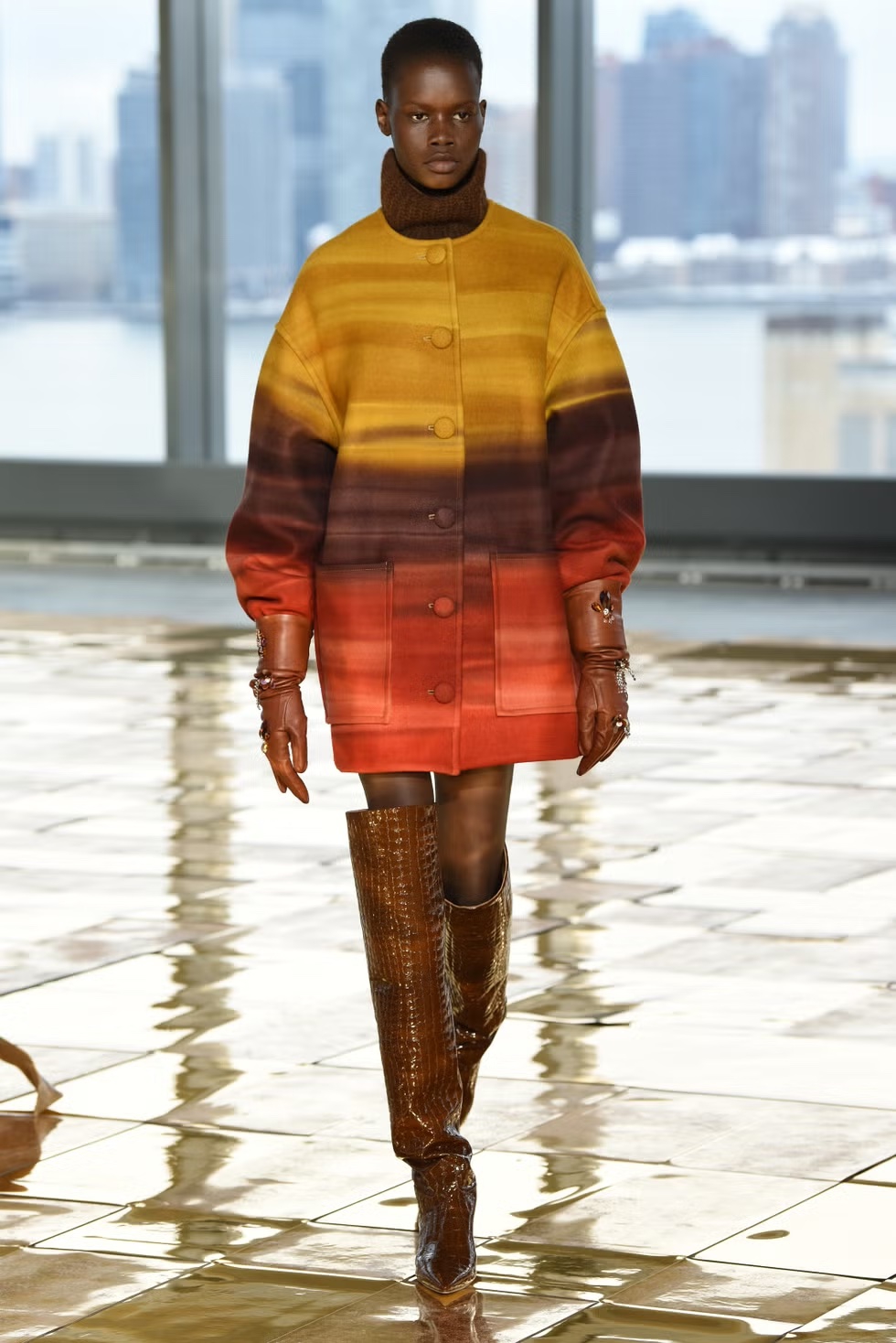 Untuk kesempatan tersebut, Taylor tampil hangat mengenakan mantel felt campuran wol bermotif ombré dari Ulla Johnson, hadir dalam palet warna merah dan oranye yang selaras dengan nuansa Chiefs. Dirancang dengan siluet drop-shoulder dan crewneck, mantel ini dilengkapi saku tempel berukuran besar, kancing tebal senada, serta sabuk serasi yang diikat di pinggang. Diambil dari koleksi Autumn/Winter 2025 label tersebut, busana ini sebelumnya ditampilkan di runway, dipadukan dengan sweter turtleneck tebal dan sepatu bot tinggi.