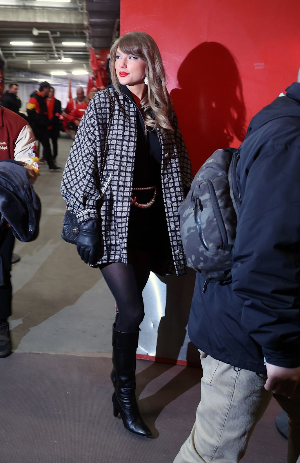 Mendukung Travis di pertandingan playoff Chiefs, Taylor memilih penampilan Chanel-di-atas-Chanel, mengenakan mantel tweed hitam-putih yang terbuka, memperlihatkan jumpsuit hitam kecil di baliknya. Ia melengkapi penampilannya dengan sabuk emas, tas quilted, dan sepatu bot setinggi lutut dari rumah mode yang sama, bersama dengan stocking hitam dan sarung tangan kulit untuk kehangatan.