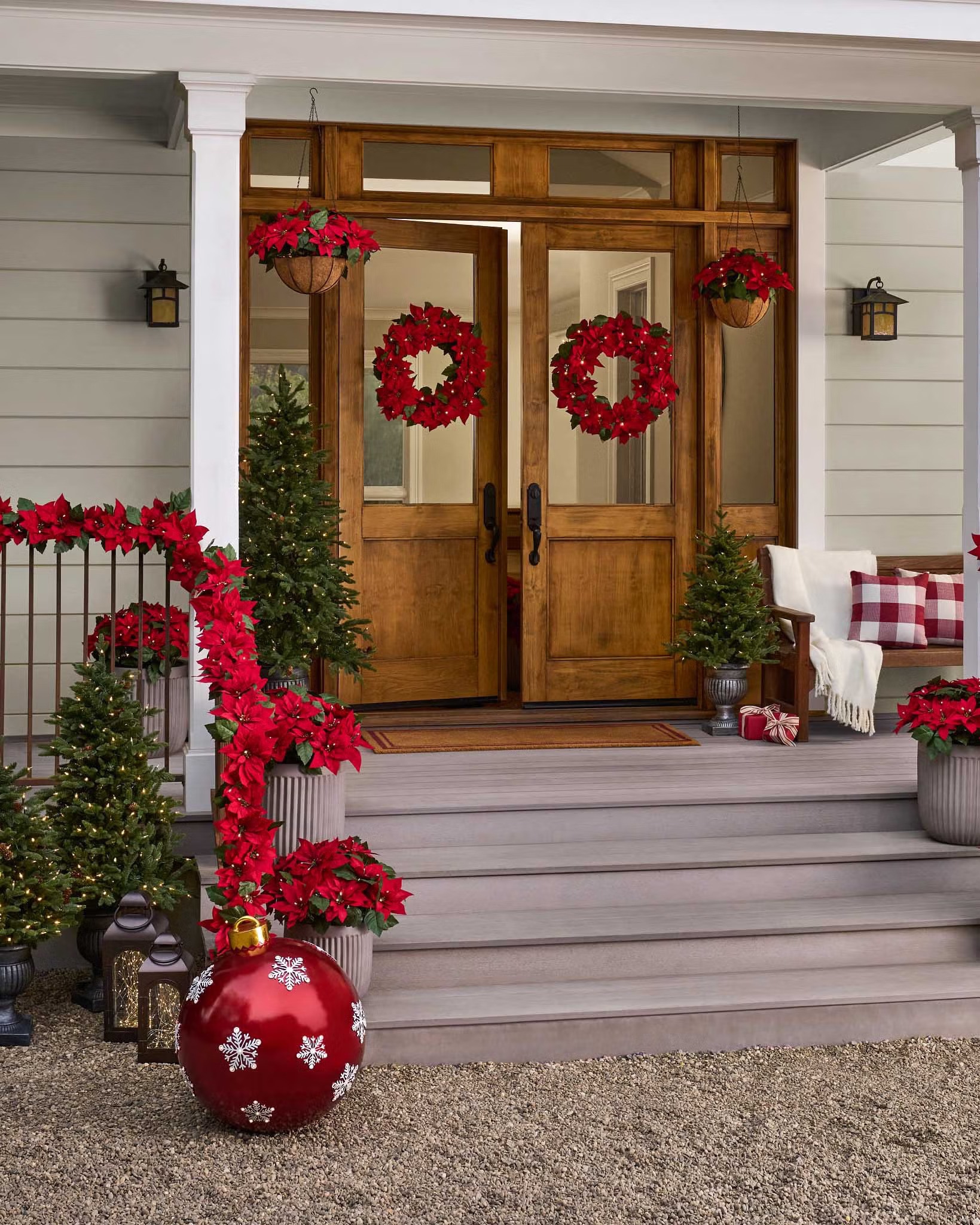 Jika Anda memiliki ruang yang cukup, Anda juga bisa meletakkan bangku kecil dengan selimut merah dan bantal bertema Natal agar teras terlihat lebih ramah dan cozy.