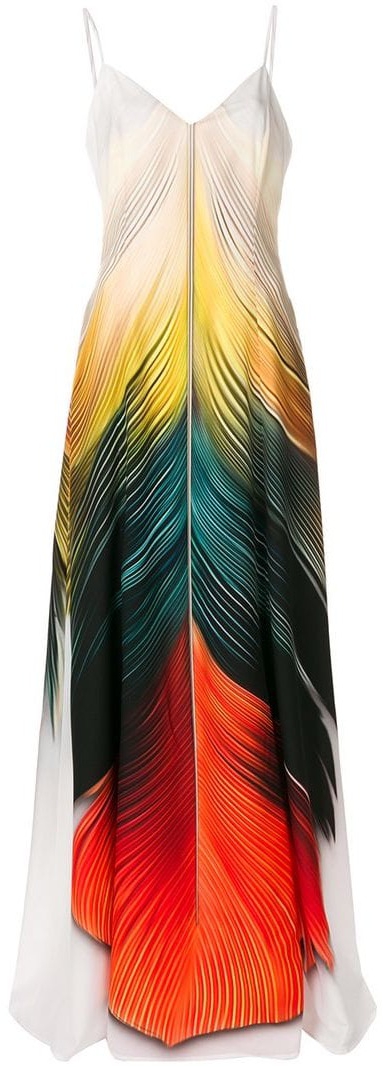 Slip dress Mary Katrantzou yang bercorak daun dengan efek gradasi dapat dikenakan untuk tampilan yang segar.