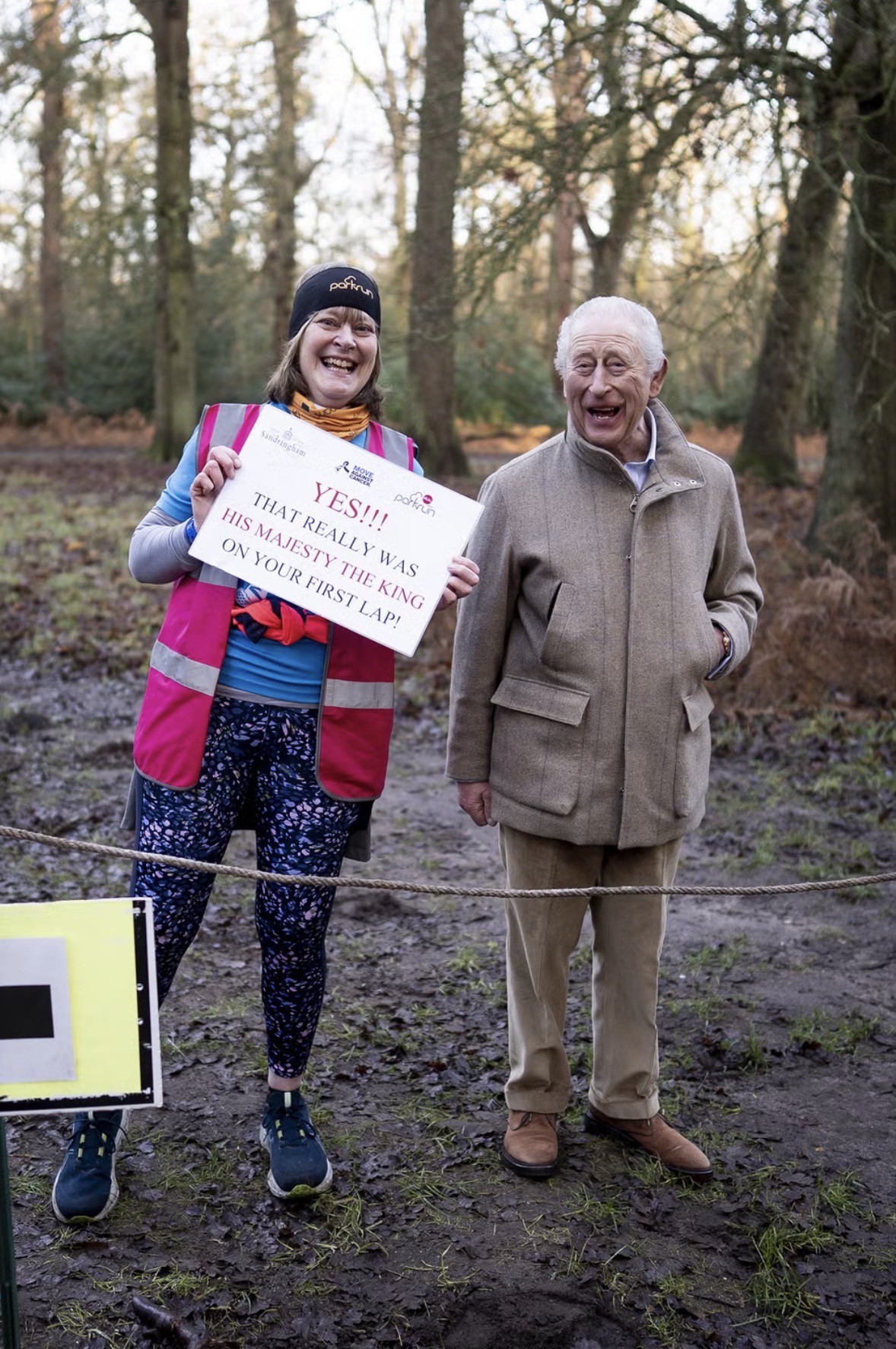 Raja Charles tampak tersenyum sambil melambaikan tangan kepada para pelari. Ia tampil kasual mengenakan mantel dan celana berwarna krem, dipadukan dengan sepatu outdoor berbahan suede cokelat. Di sampingnya, seorang relawan terlihat memegang papan bertuliskan, “Yes!!! That really was His Majesty the King on your first lap.”