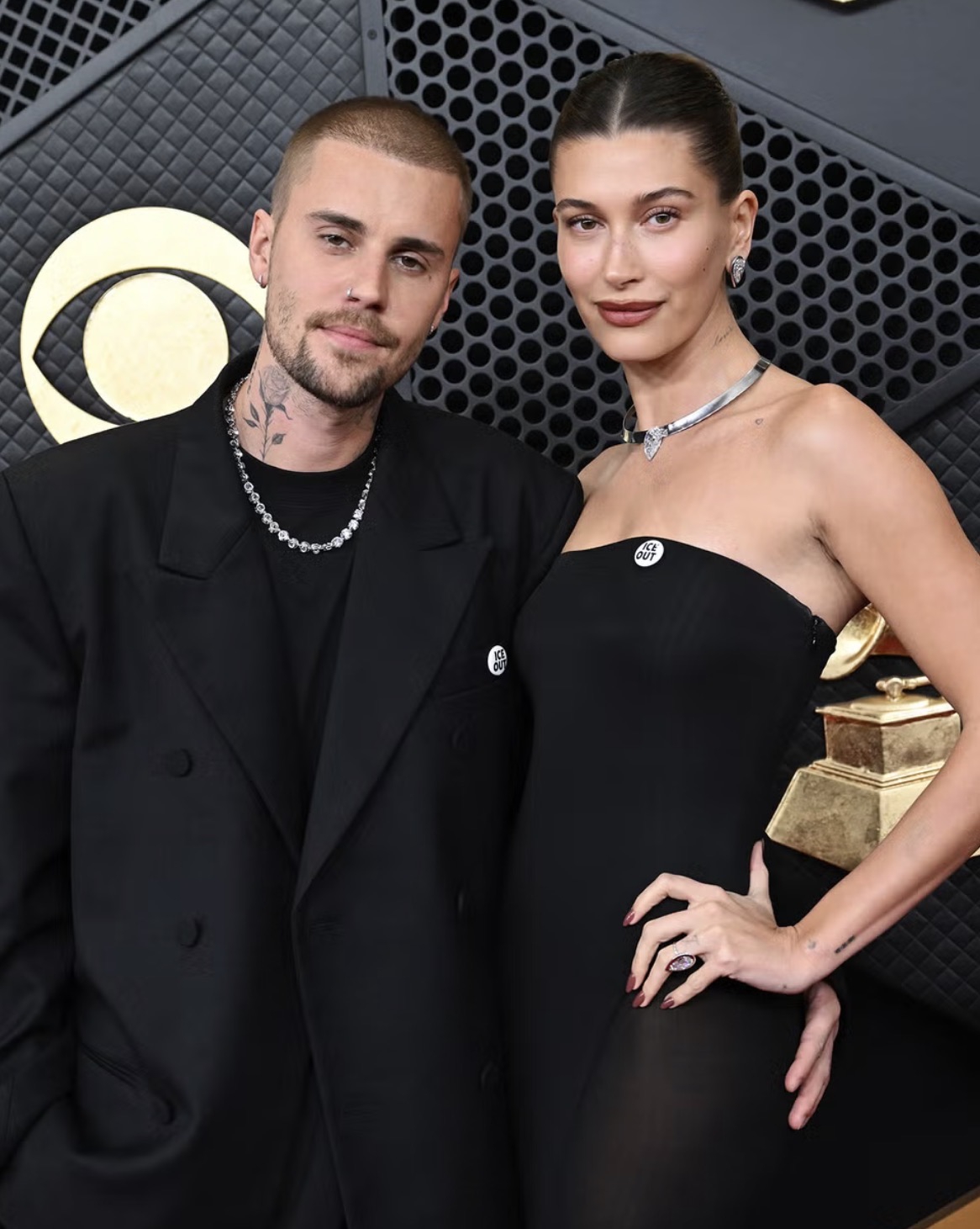 Pasangan Bieber tampil serasi mengenakan busana serba hitam dengan pin bertuliskan “ICE Out” saat menghadiri Grammy, sebelum kemudian berganti pakaian pesta untuk merayakan malam tersebut dalam sebuah perayaan larut malam.