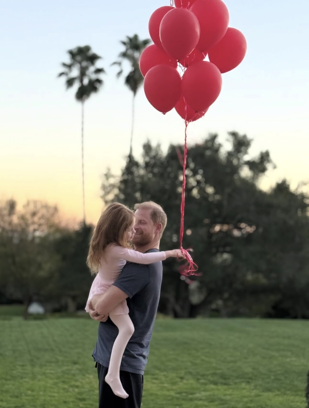Dalam foto tersebut, PangeranHarry terlihat menggendong putri mereka, Putri Lilibet Diana. Anak berusia empat tahun itu memeluk ayahnya dengan satu tangan, sementara tangan lainnya memegang rangkaian balon berbentuk hati. Tentu saja, sesuai dengan nuansa hari kasih sayang.