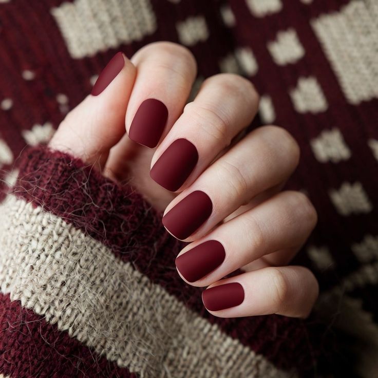 Ubah tampilan glossy menjadi matte dengan top coat khusus untuk nuansa lebih edgy. Nail art kuku pendek maroon dengan efek matte menghadirkan kesan kontemporer dan understated. Tekstur matte membuat warna terlihat lebih dalam dan dramatis, namun tetap sophisticated. Gaya ini sangat cocok dipadukan dengan busana monokrom atau tailored look. Hasil akhirnya sederhana, tetapi memberikan impresi kuat dan modern.