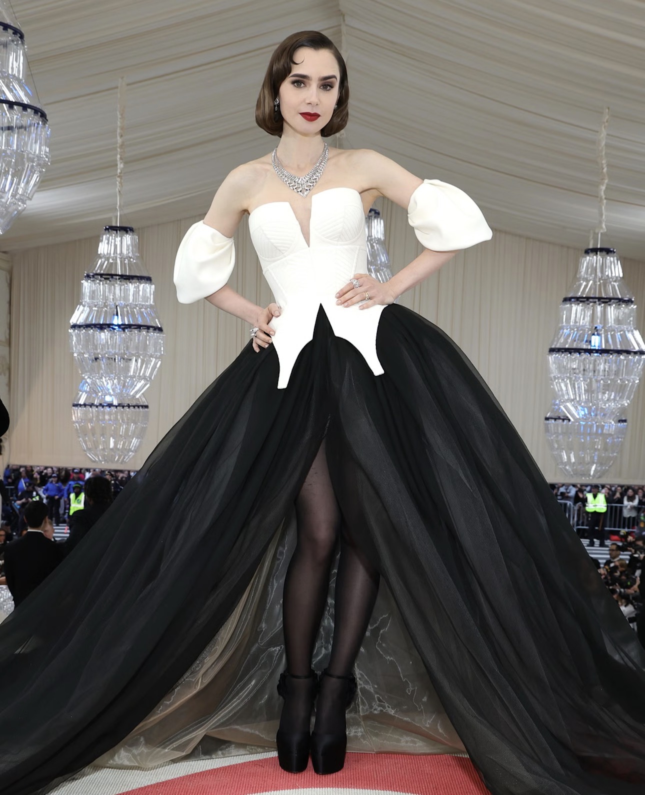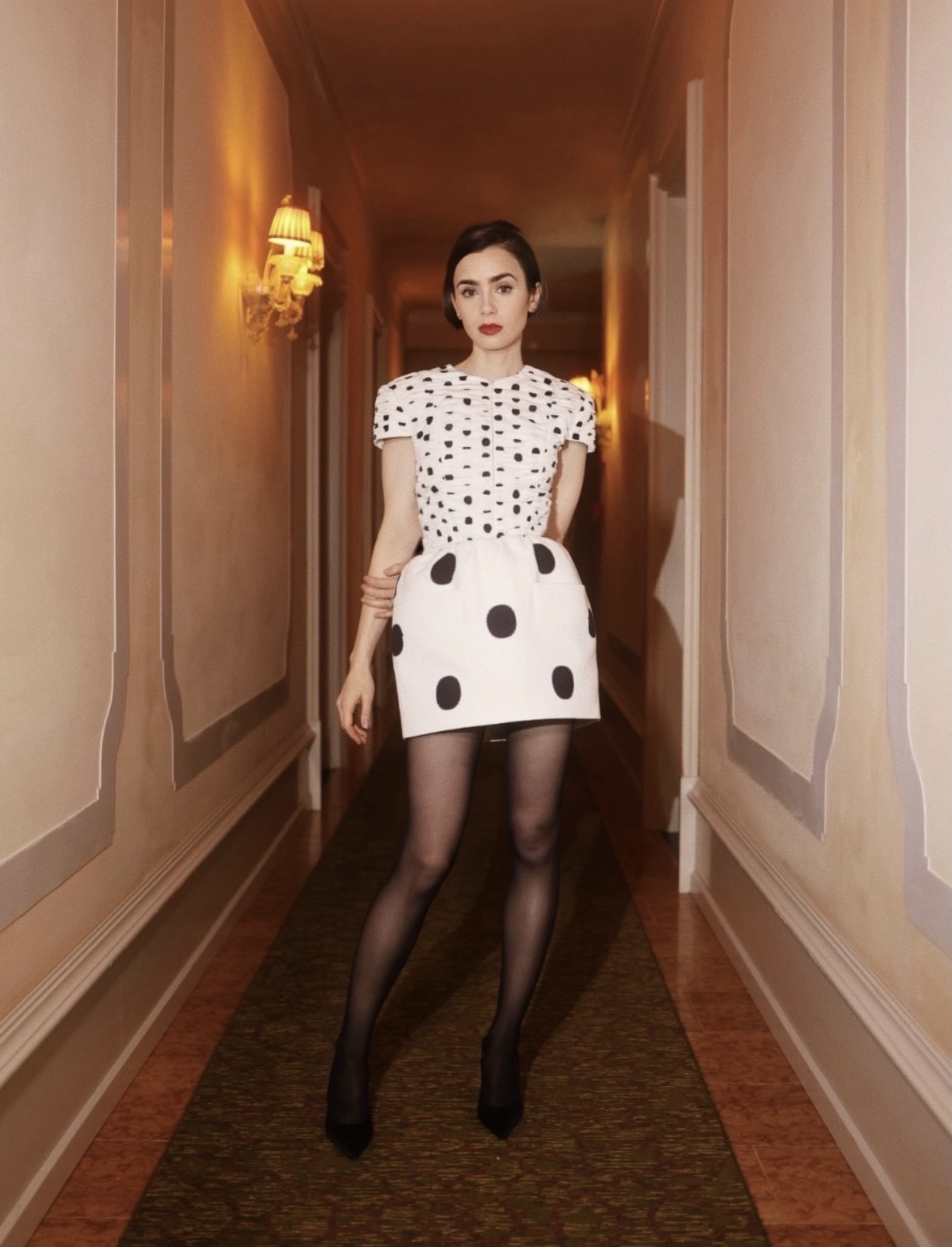 Audrey Hepburn dikenal menyukai kombinasi warna hitam dan putih yang klasik dan di sini Lily mencoba gaya tersebut. Ia mengenakan tampilan dari koleksi Patou Spring 2026 yang dipadukan dengan slingback pumps, anting Cartier, serta lipstik merah. Sangat Audrey Hepburn.