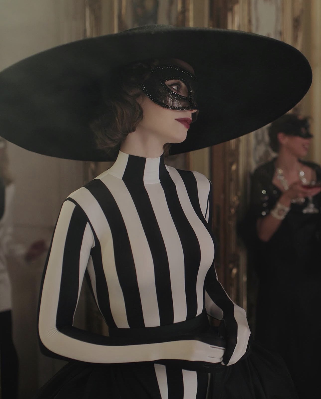 Untuk adegan pesta topeng di Emily in Paris, desainer Harris Reed (sahabat Lily) merancang jumpsuit garis hitam-putih yang mencolok dengan cape coat elegan dan topi besar. Ia membagikan beberapa inspirasinya di balik tampilan tersebut, termasuk busana yang dikenakan Audrey Hepburn dalam My Fair Lady.