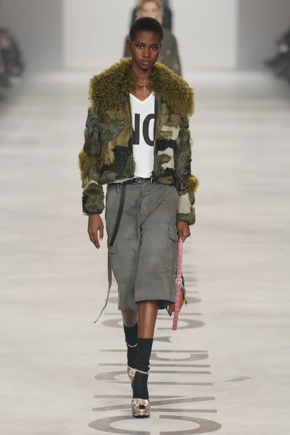 Menjelang paruh kedua koleksi, Maria Grazia Chiuri mulai bereksperimen lebih banyak. Ia mengulang satu busana dalam beberapa versi berbeda, ada rompi berhiaskan bulu yang dikenakan dengan kaus bergambar dan celana pendek kargo selutut, serta dilengkapi dengan kaus kaki tipis, sepatu hak tinggi, dan tas baguette. (Salah satu versi selanjutnya mengganti rompi dengan jaket kamuflase.) Bagaimana pun, rumah mode Fendi berawal dari usaha pembuatan pakaian bulu yang terlihat pada beberapa mantel di sepanjang koleksi, misalnya seperti pada rompi tersebut dan sedikit terlihat dari beberapa kerah. Ia menampilkan setelan penerbangan dengan ritsleting diagonal dan setelan denim Kanada, dua kali dalam denim indigo dan sekali dalam warna krem yang dikenakan dengan sepatu bot koboi. Aksesorinya bernuansa humoris misalnya kalung lariat yang menjuntai dan kerah tuksedo yang berdiri sendiri, beberapa di antaranya terbuat dari bulu.