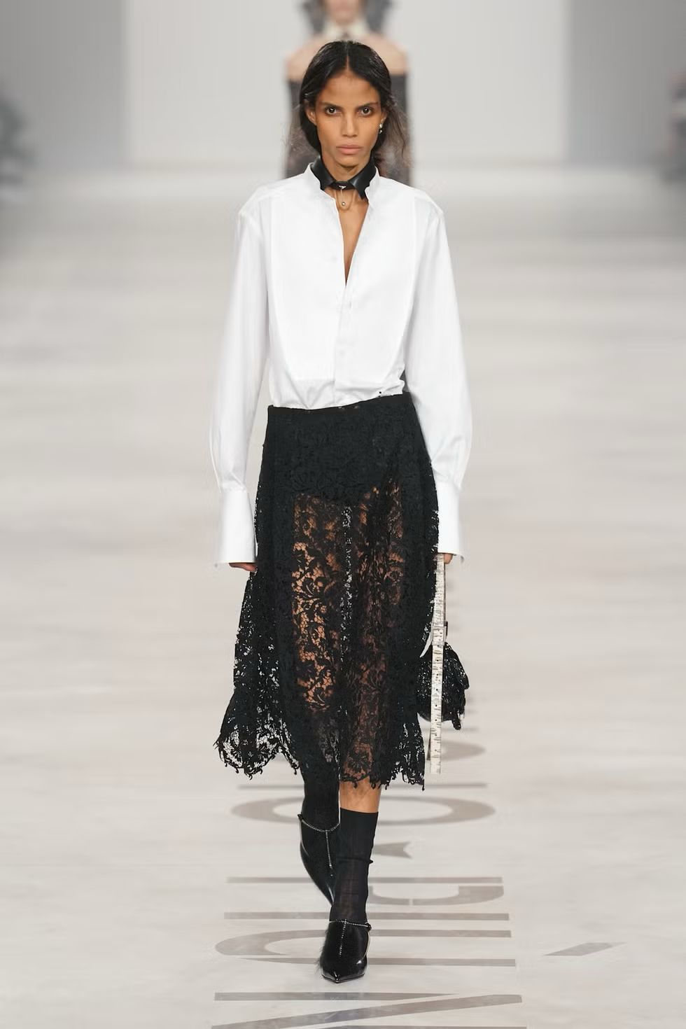 Teknik penjahitan yang seringkali santai dalam hal ini, memainkan peran utama dalam koleksi Fendi karya Maria Grazia Chiuri yang tidak mengherankan. Itu adalah sesuatu yang menjadi ciri khasnya. Koleksi debutnya memiliki lambang dari karyanya di Dior, tempat ia sebelumnya menjabat sebagai direktur kreatif dari tahun 2016 hingga musim panas tahun lalu. Misalnya, kemeja tuksedo dengan rok renda penuh yang sangat mengingatkan pada siluet yang ia ciptakan selama hampir satu dekade. Ia juga masih menyukai slogan, seperti yang dibuktikan oleh syal yang dibawa bersama tas tangan bertuliskan "impact," kaus bertuliskan "NO," bahkan panggung peragaan busana itu sendiri, mengingatkan kembali pada kaus "We should all be feminists" miliknya di Dior.