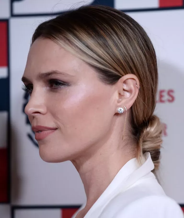 Low messy bun dibuat di bagian bawah kepala, dekat tengkuk.