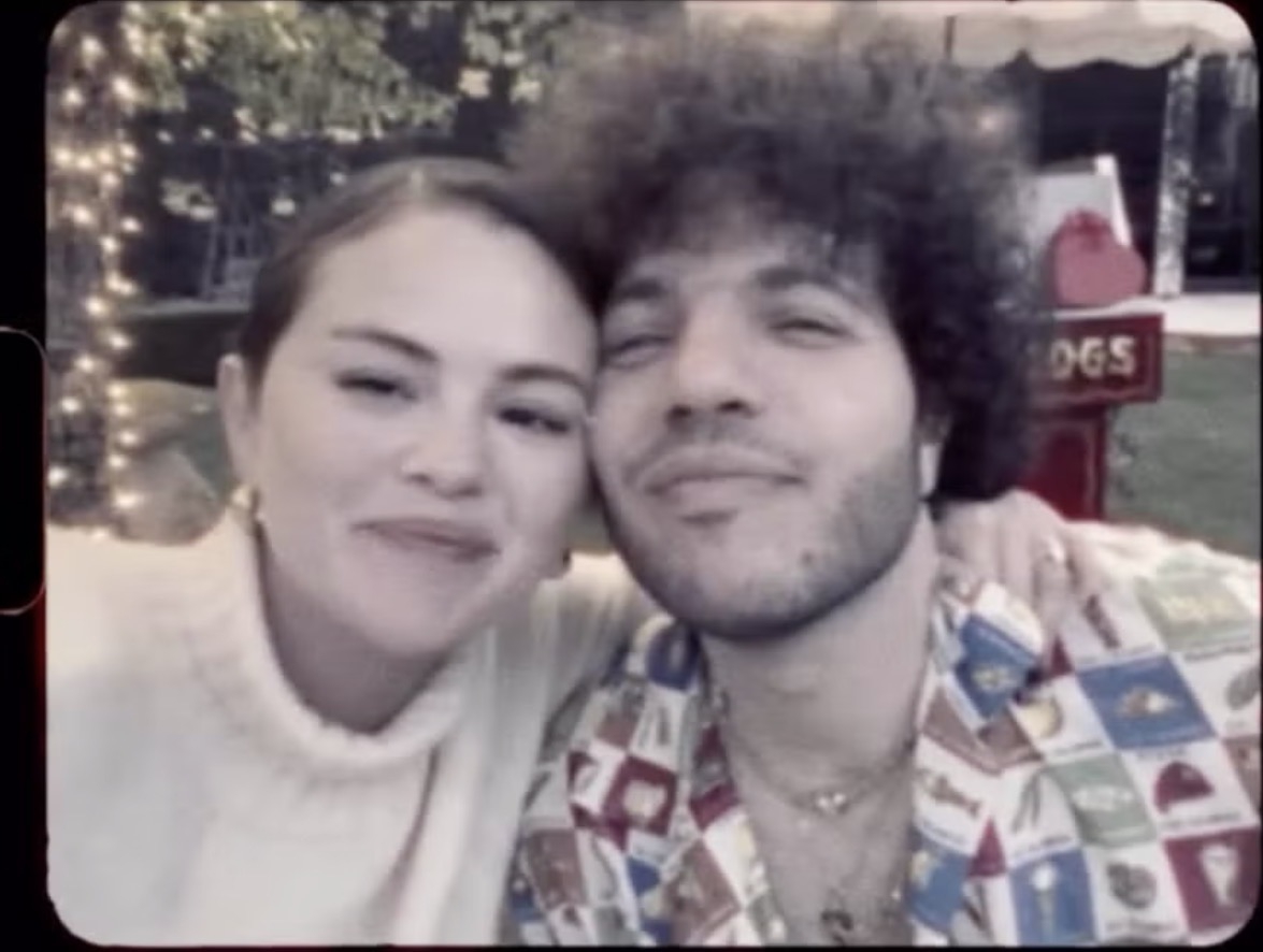 Dalam klip tersebut, Selena mengenakan sweater rajut putih berkerah tinggi dan menata rambutnya dengan tatanan sanggul rendah, menampilkan anting emas berukuran besar dengan desain sculptural. Bahkan dengan filter retro bernuansa sedikit sepia, rona blush dari Rare Beauty tetap terlihat jelas. Atau mungkin itu efek dari kehadiran Benny.
