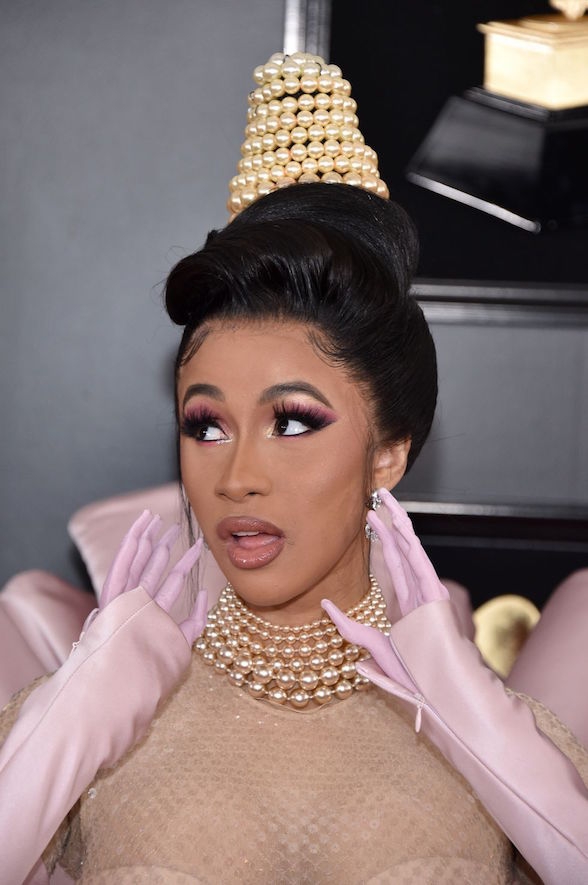 Untuk malam kemenangan penghargaan Grammy pertamanya, Cardi B menata rambutnya tinggi seperti sebuah sarang lebah yang dihias oleh mutiara.