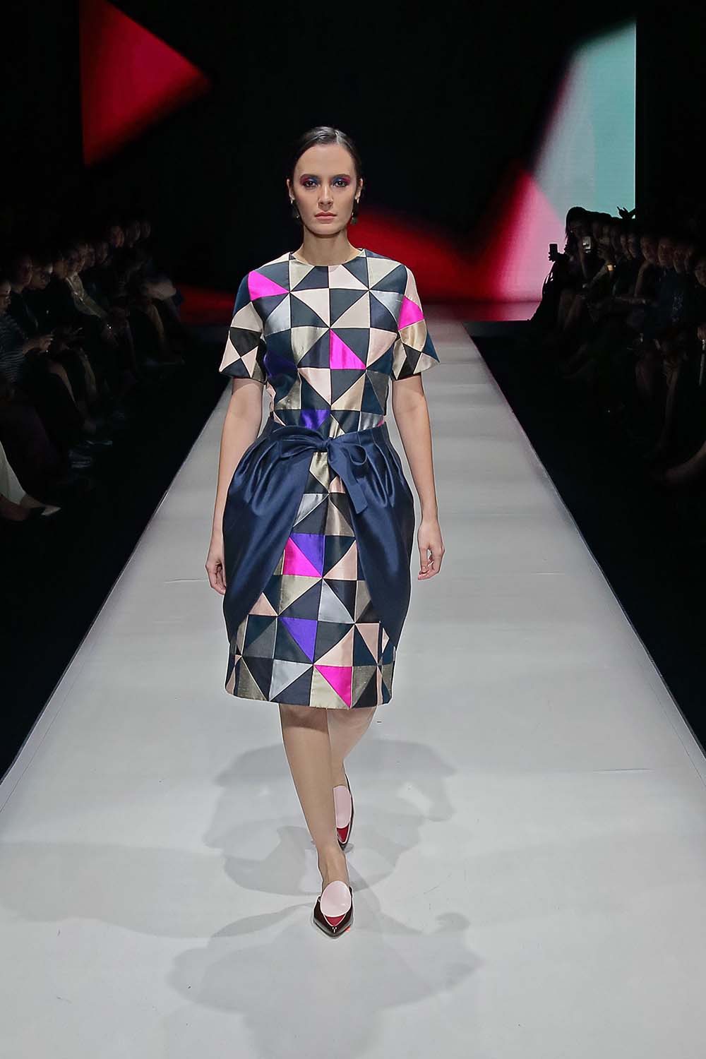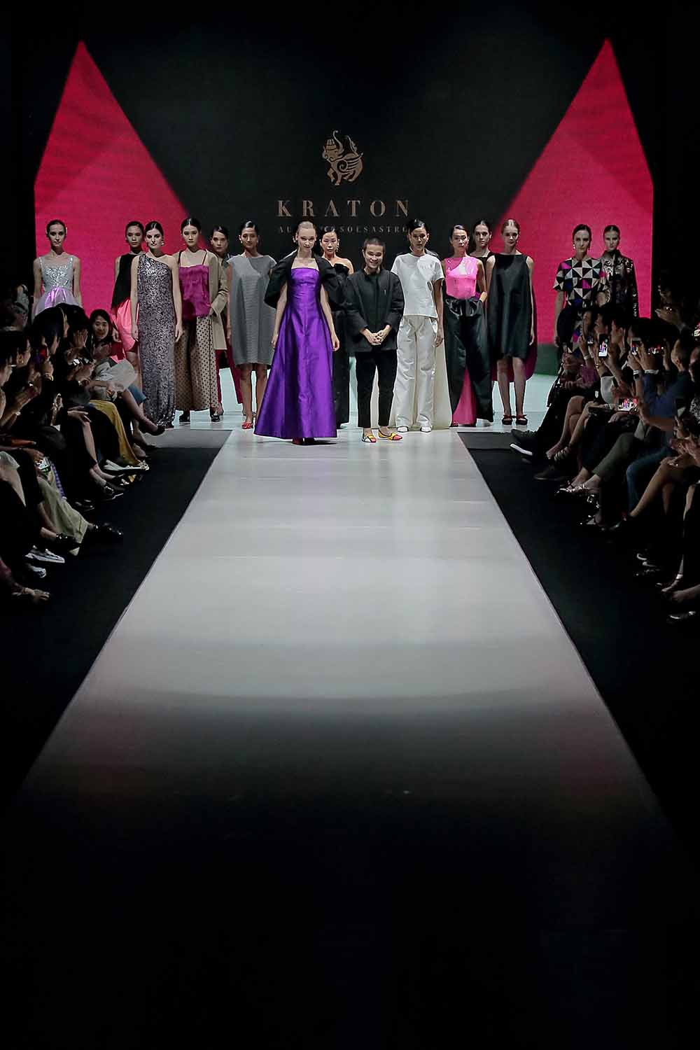 Selanjutnya, Kraton by Auguste Soesastro hadir dengan gaun berpotongan tegas, dan permainan warna yang kontras. Penggunaan warna bold membuat koleksi dari Kraton terlihat sangat menawan.