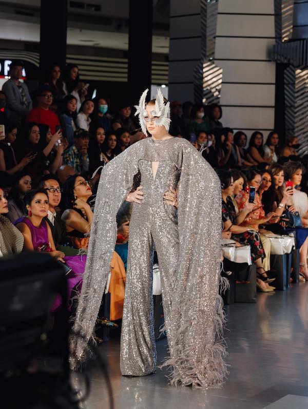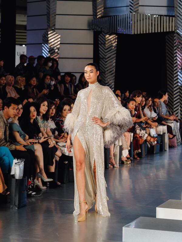 Permainan bahan taffeta, bulu, sequins, pita, fringes, dan material bertabur motif print dengan percampuran warna yang vibran dan kontras juga mendominasi koleksi ini, sekaligus merepresentasikan kebebasan dalam berekspresi yang tiada batas.