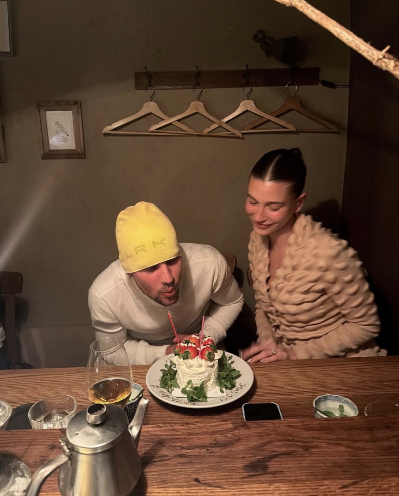 Dalam foto-foto itu, pasangan Bieber tampak menikmati makan malam intim bersama, dan pelantun “Daisies” tersebut duduk di depan kue kecil yang dihiasi stroberi dan beberapa lilin tinggi.
