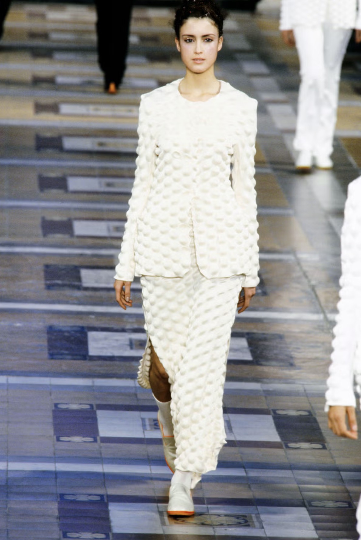 Sementara itu, Hailey memilih atasan nude vintage dari koleksi Fall 2000 rancangan Issey Miyake, yang ditandai dengan detail garis melengkung bulat yang tampak timbul di seluruh permukaan materialnya.