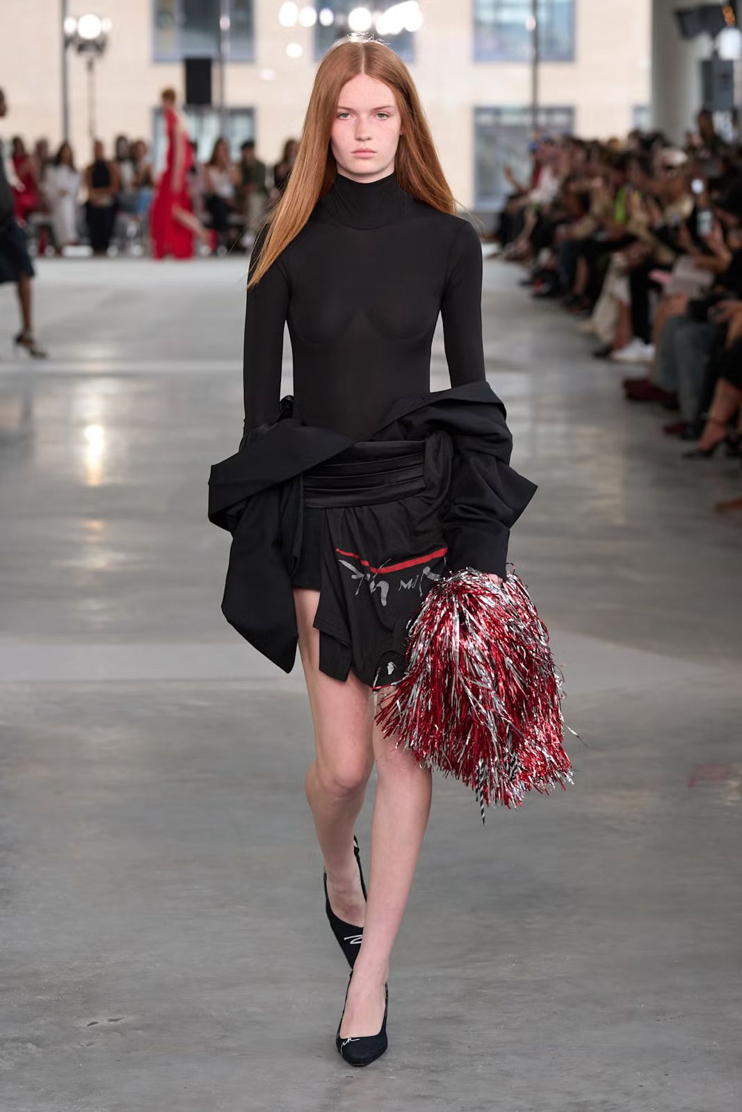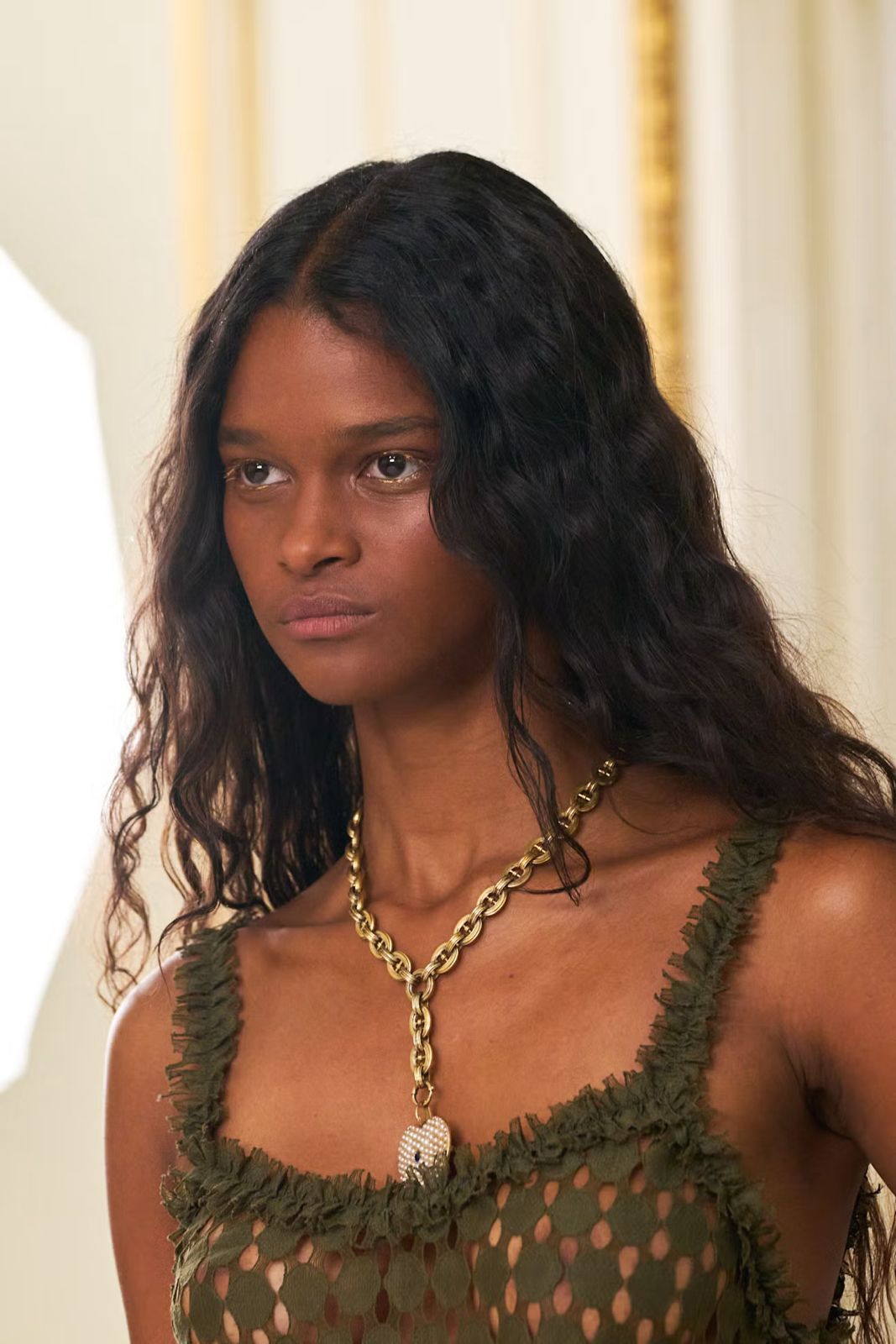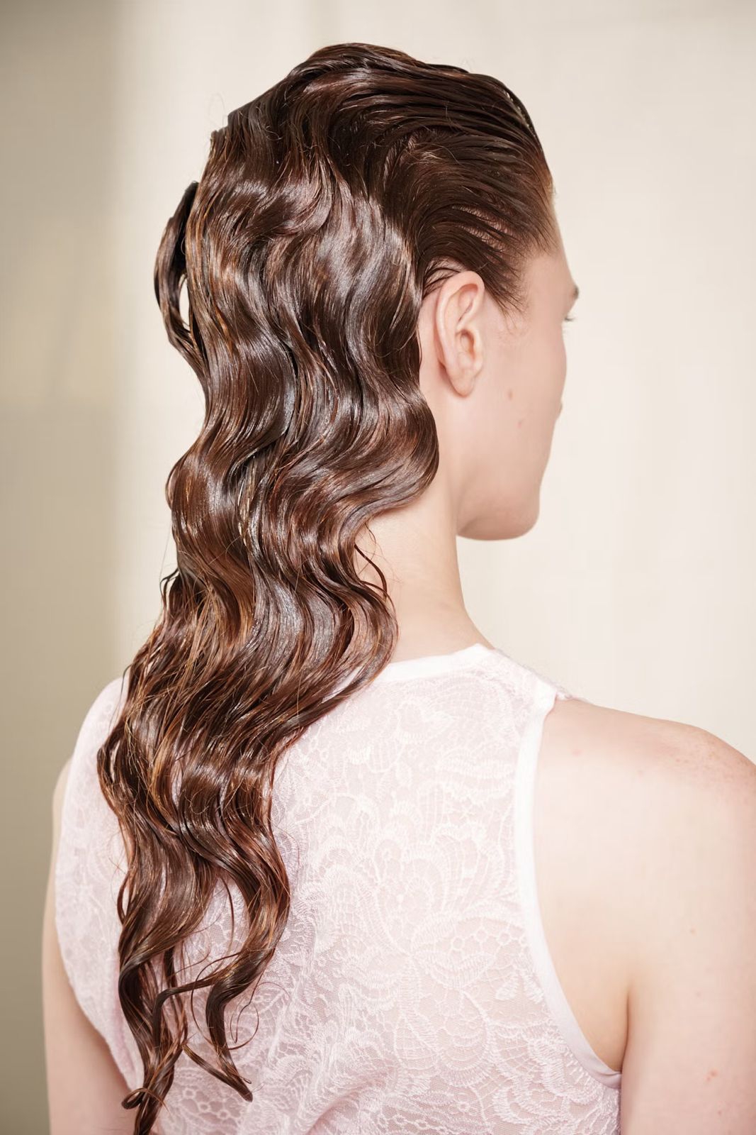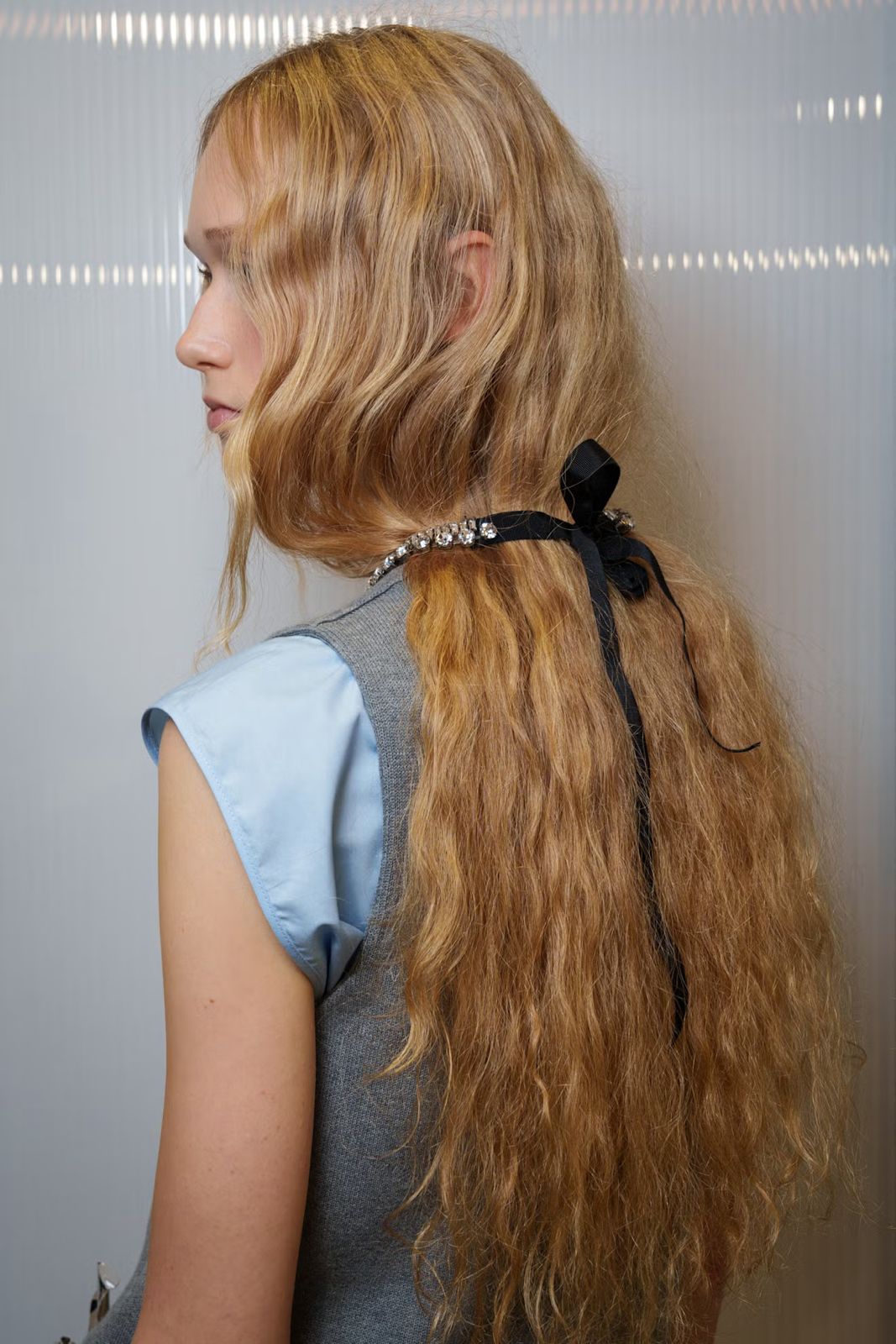 Nº21 memadukan dua tren rambut Spring/Summer 2026, dengan gelombang panjang hingga punggung yang dihiasi bedazzled ribbons yang diselempangkan longgar seperti kalung.