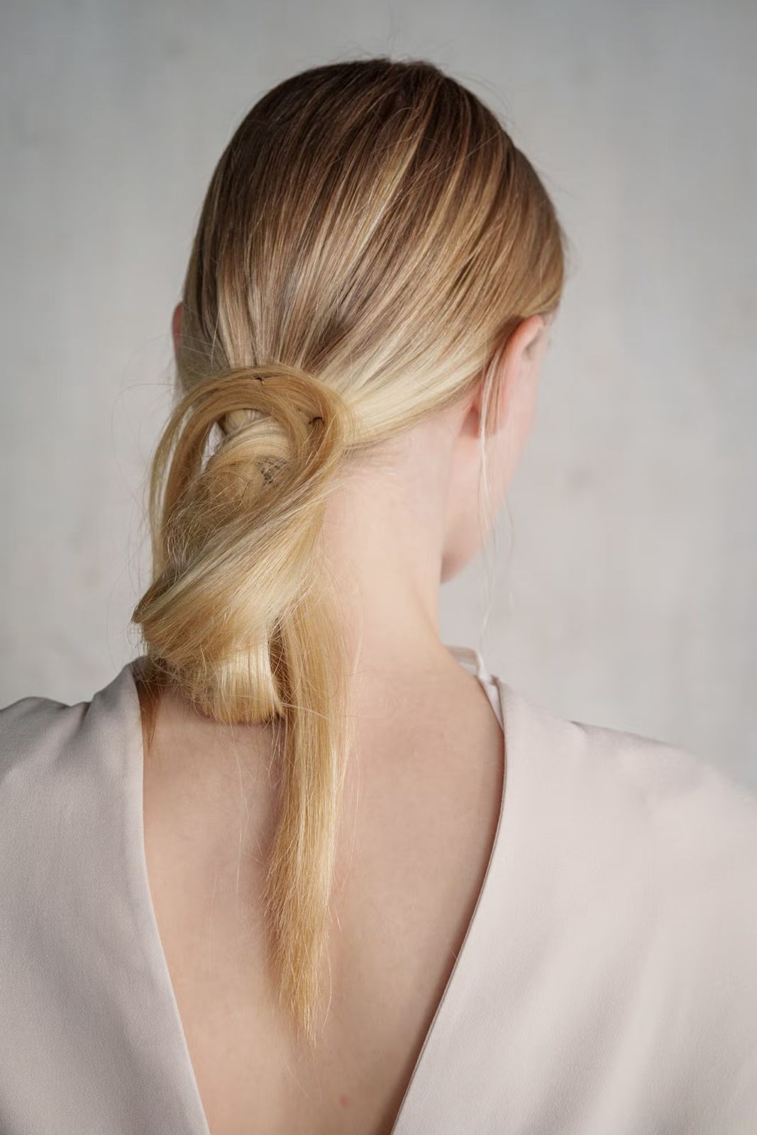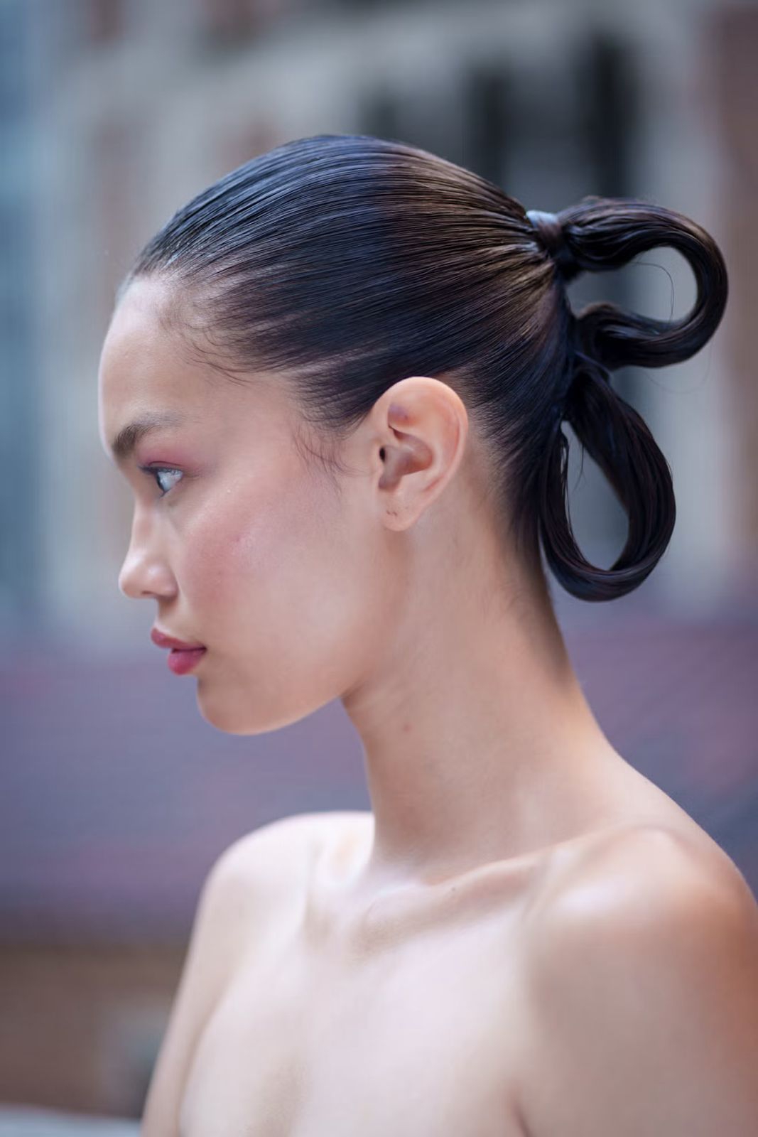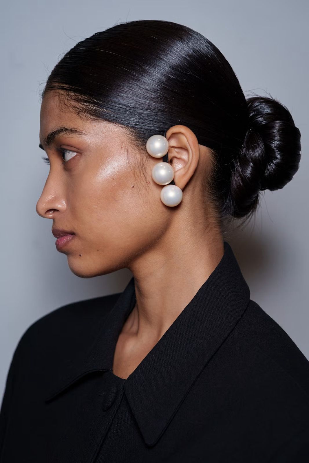 Para model di presentasi Tove Spring/Summer 2026 menampilkan chignon yang dikumpulkan namun tetap terlihat santai di dekat tengkuk leher, dengan beberapa helai rambut tipis yang diselipkan lembut di belakang setiap telinga.
