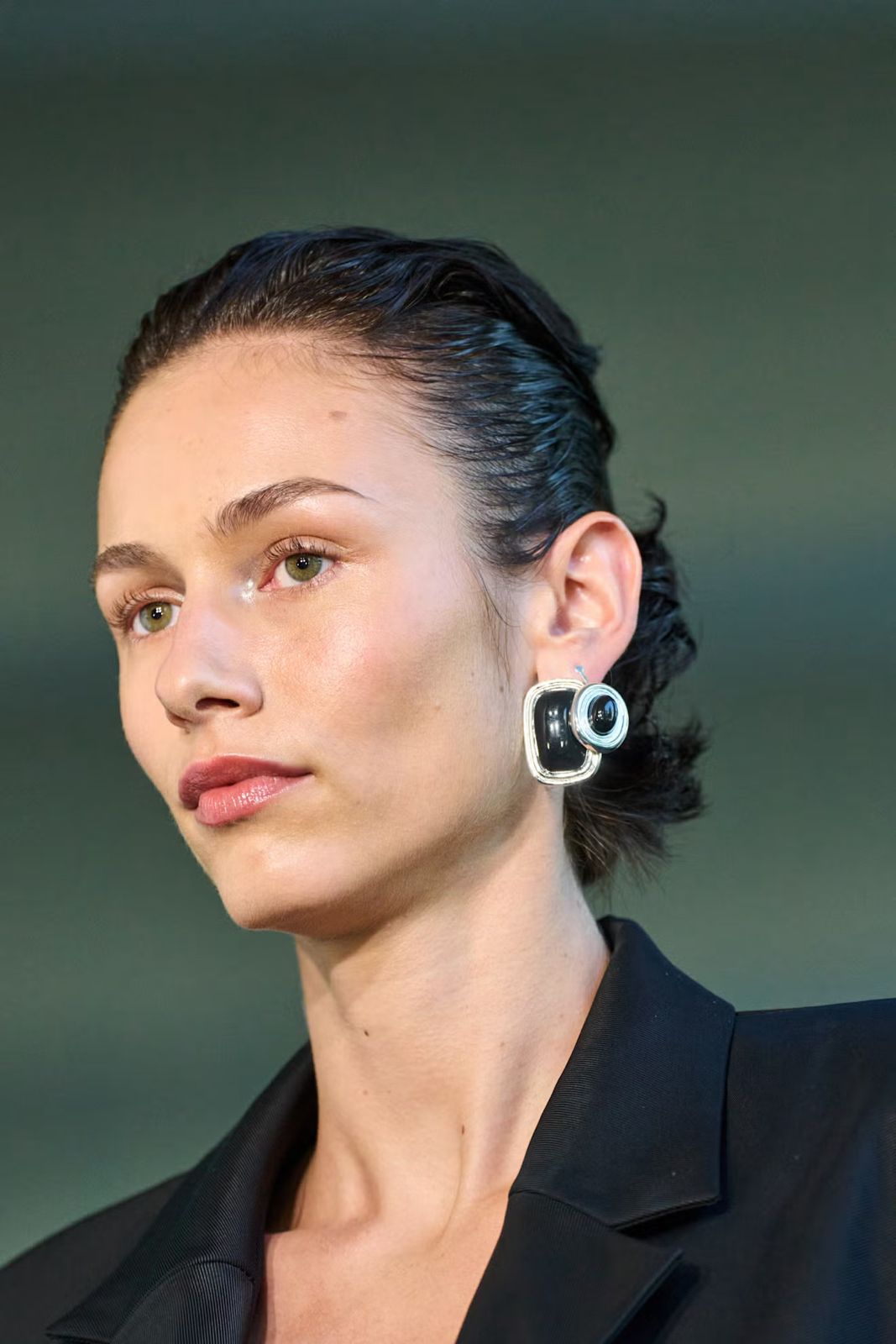 Gaya slicked-back di runway Christopher Esber tampil seimbang antara terstruktur dan lembut, dengan penekanan ekstra pada sculpting di bagian samping rambut.
