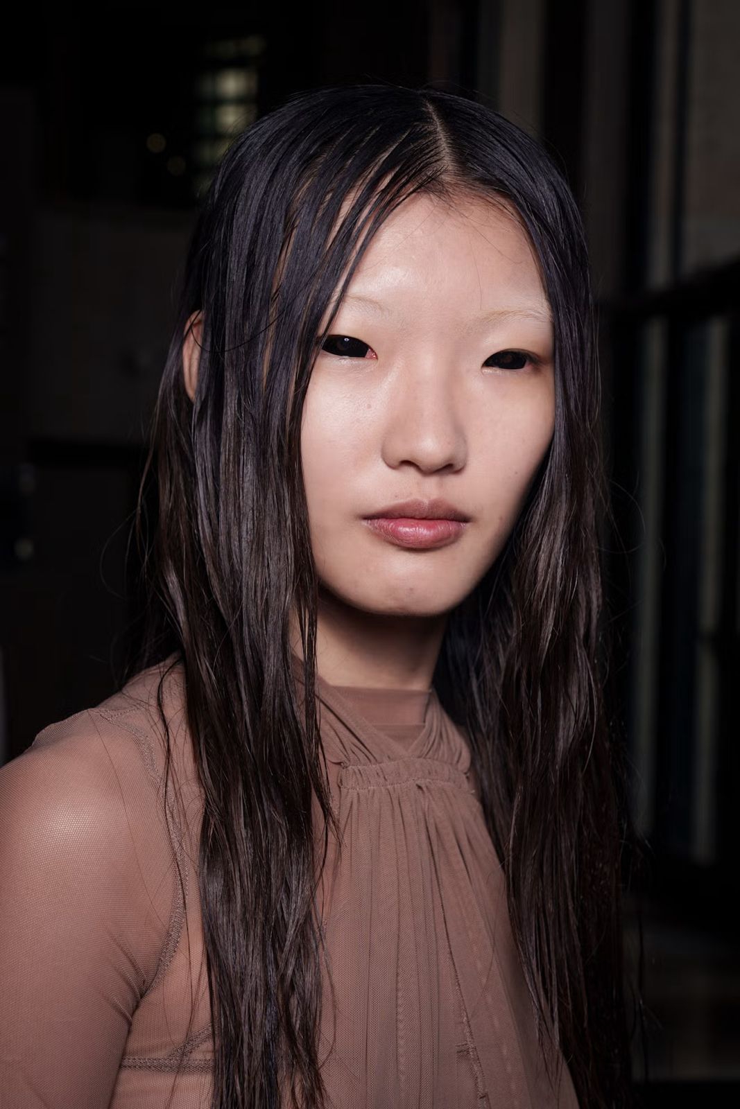 Gaya rambut grungy yang dikeringkan secara alami memberi tampilan para model di Rick Owens ekstra edgy musim ini.