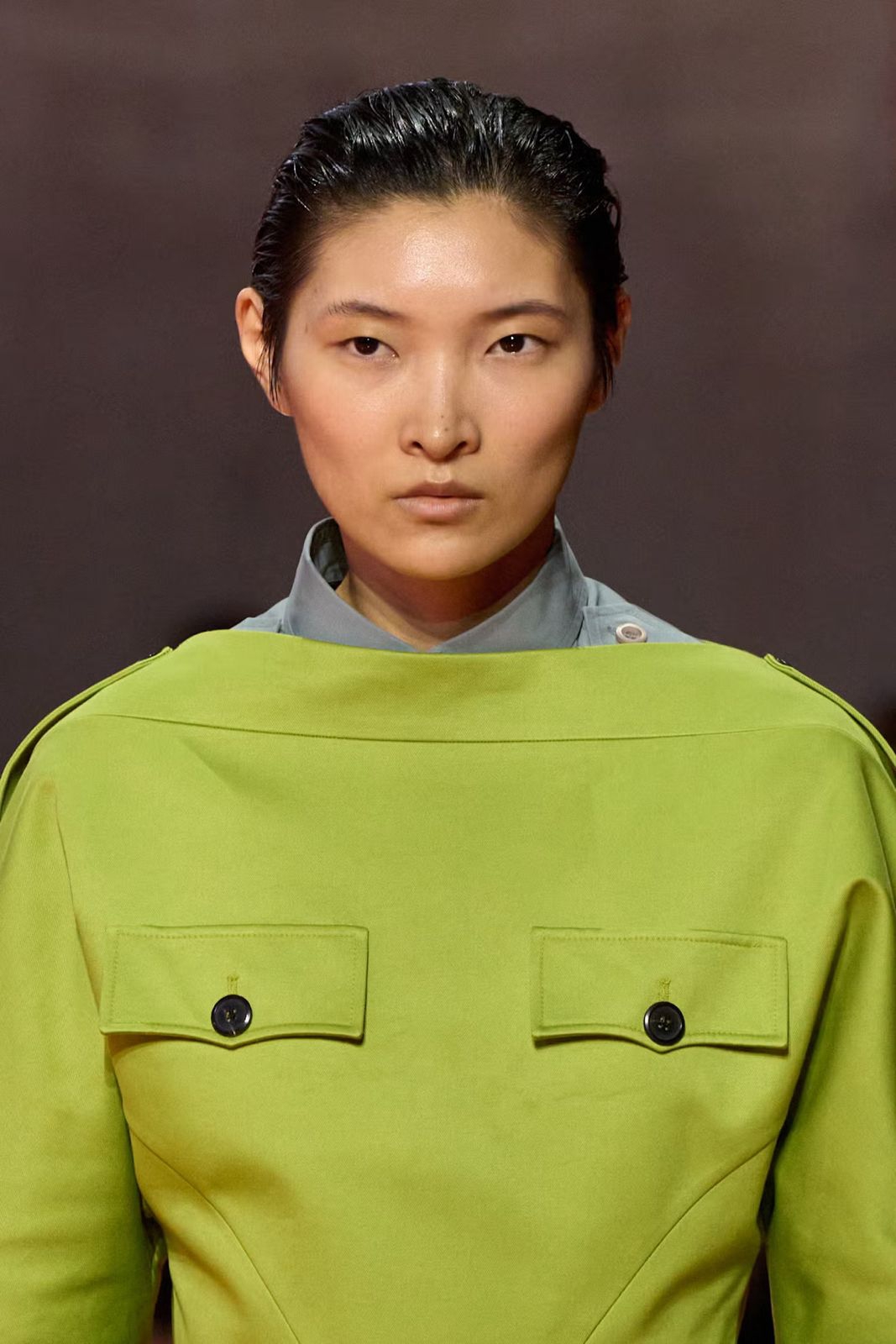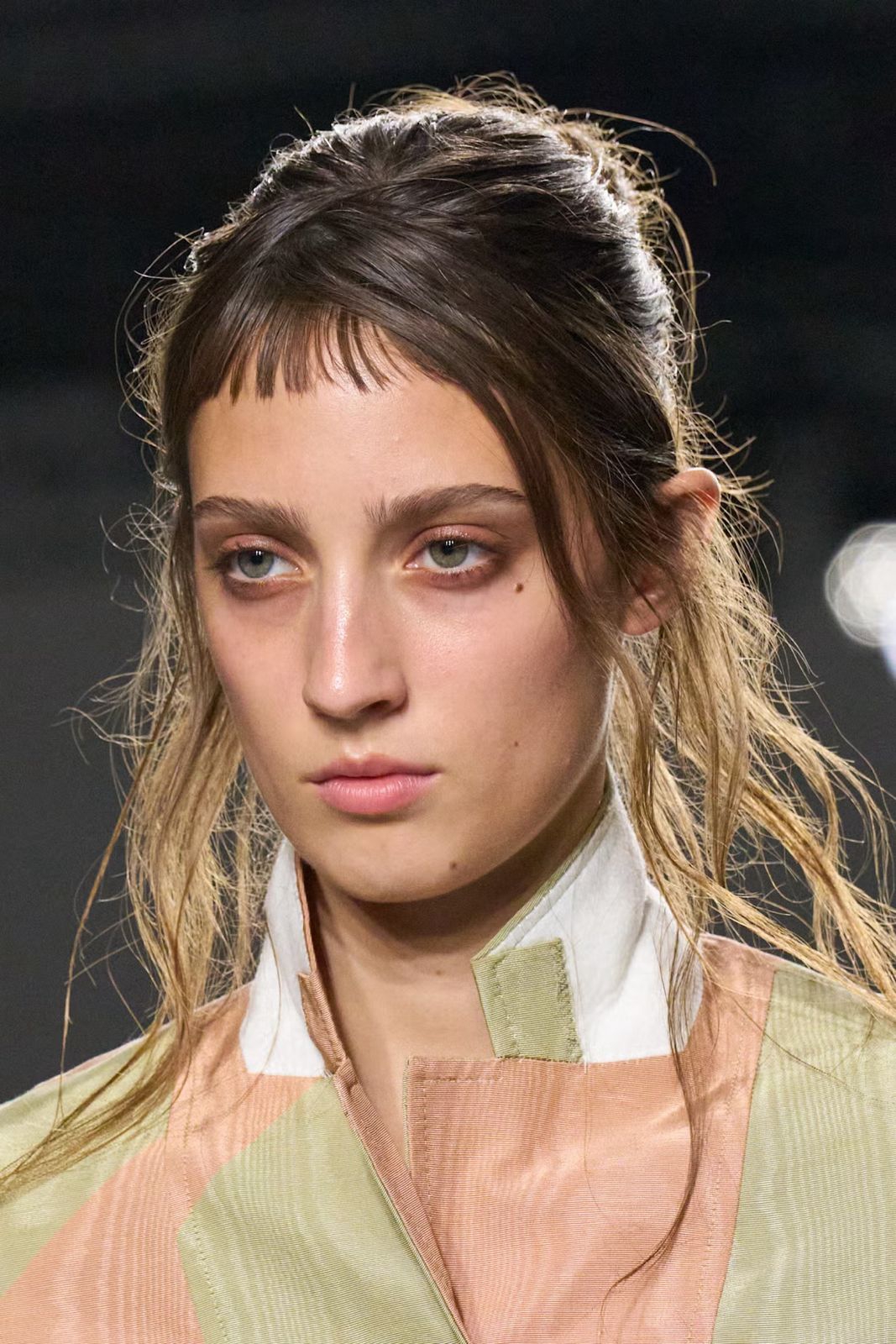 Kepangan slicked-back di runway Acne Studios diberi sentuhan berbeda melalui bangs yang piecey dan tampak tertiup angin, menambah dimensi pada keseluruhan gaya.