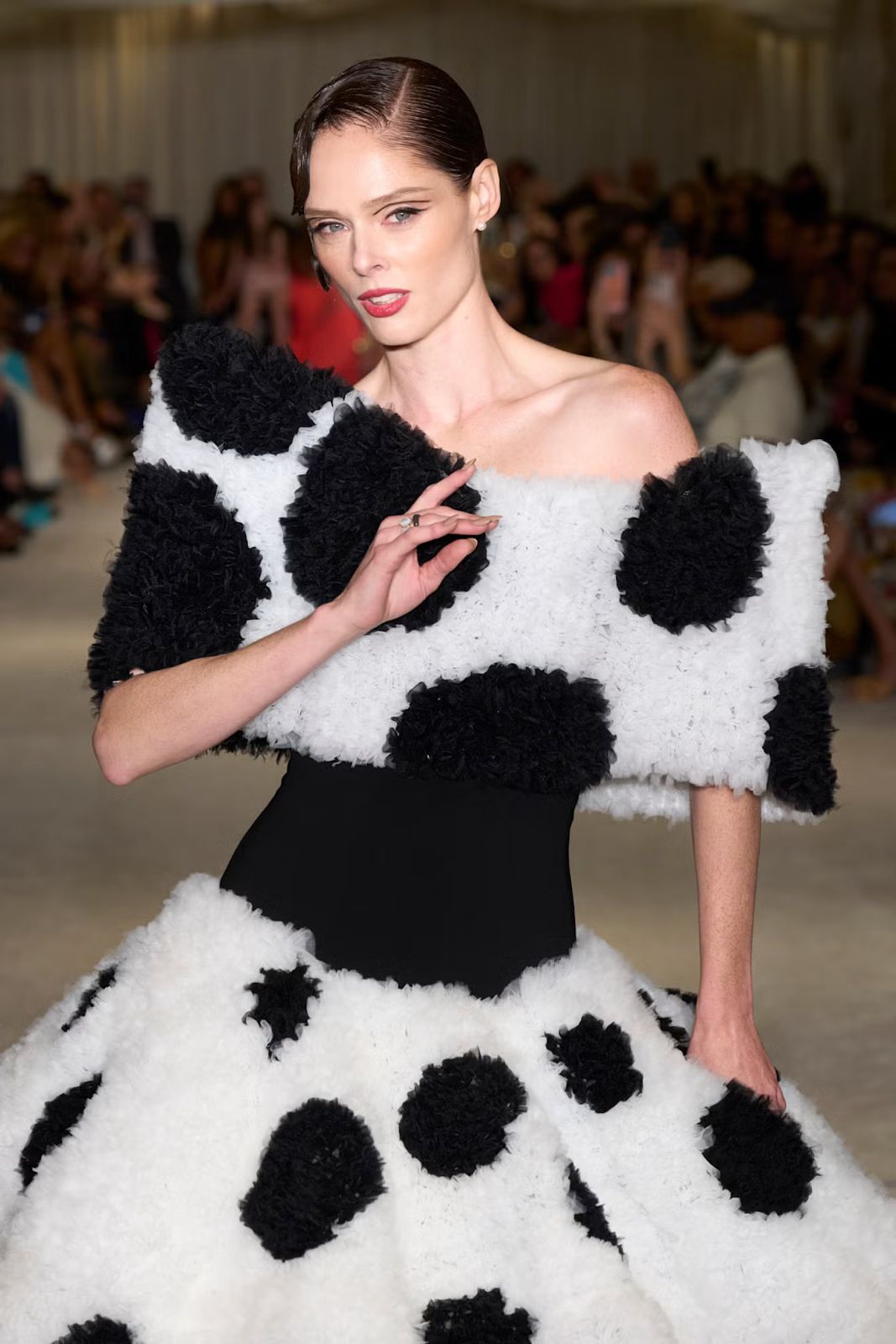 Gelombang elegan dengan kilau tinggi mengalir menuruni punggung para model di catwalk Giambattista Valli.