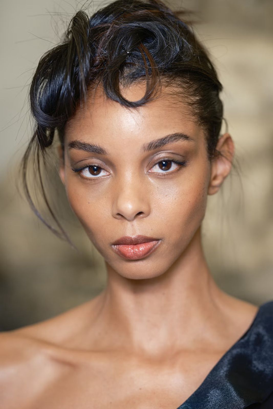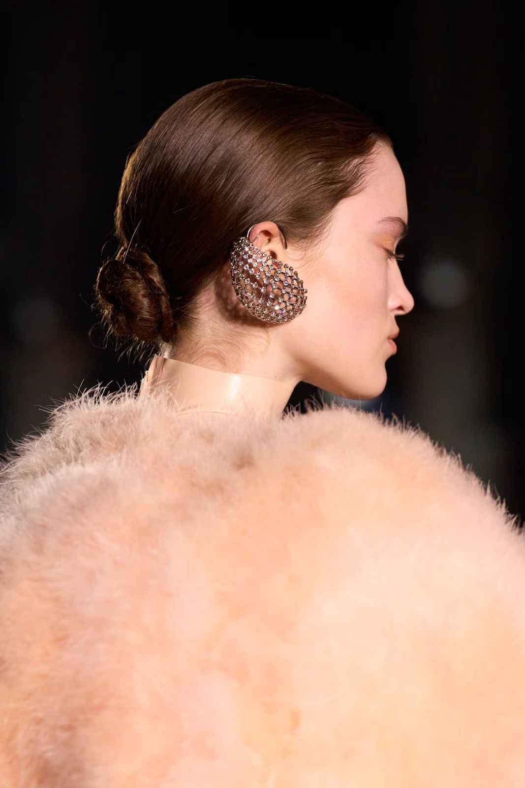 Sanggul rendah klasik menjadi sentuhan akhir yang sempurna pada tampilan kecantikan Mugler yang canggih dan tak lekang oleh waktu musim ini.
