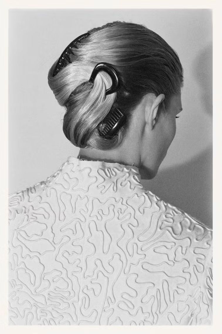 Siapa bilang sisir hanya berfungsi untuk merapikan rambut? Para model di presentasi musim ini dari The Row tampil dengan updo yang ditahan menggunakan French pin dan hair comb, diciptakan oleh hairstylist Guido Palau bersama timnya.