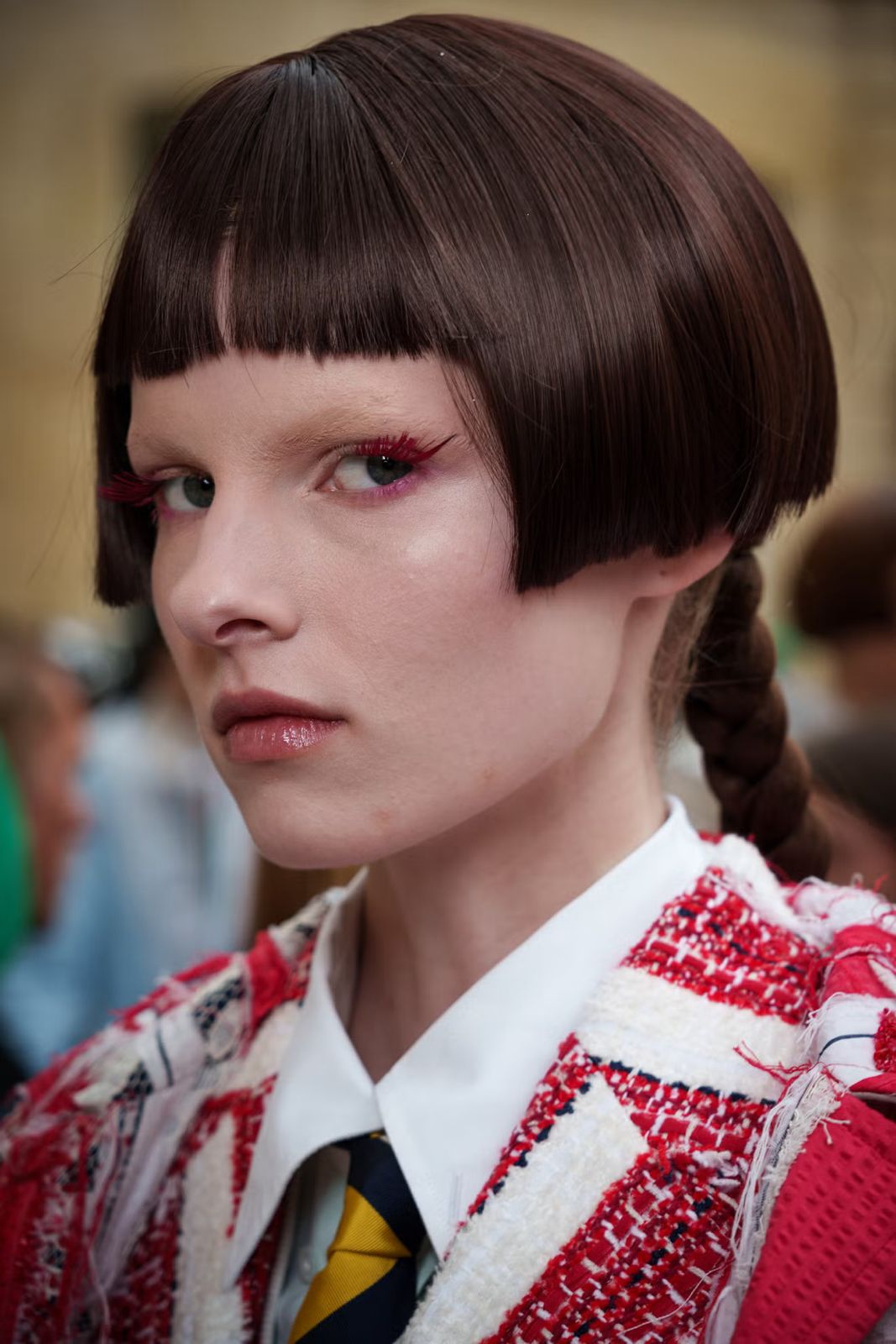 Potongan mushroom cut mendapat sentuhan modern berkat para stylist di runway Thom Browne yang mempertegas tampilan berlapisnya dengan ponytail kepang yang menjuntai rendah.