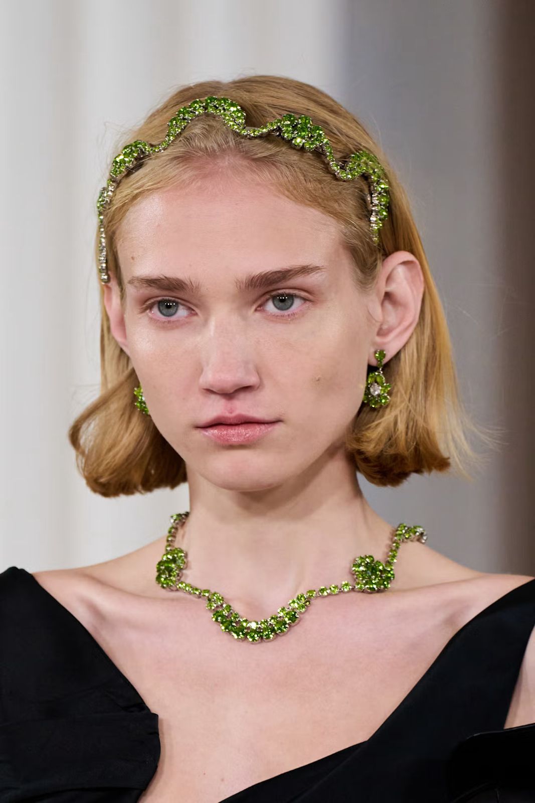 Headpiece bertabur permata, statement earrings bermotif cermin, serta kalung mencuri perhatian di catwalk Simone Rocha musim ini, memperkuat nuansa glamor terstruktur dalam setiap tampilan rancangan sang desainer.