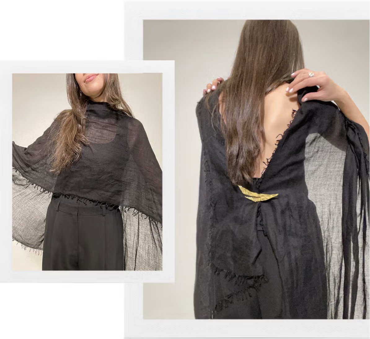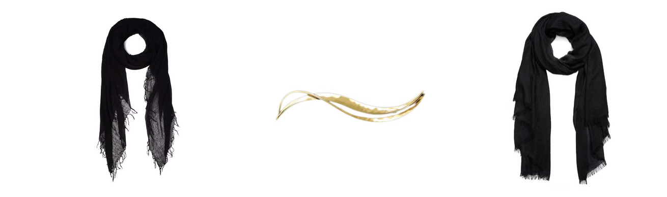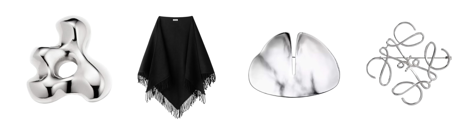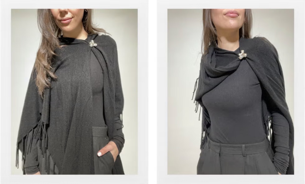 Ubah scarf lilit menjadi cape dengan mengencangkannya menggunakan bros minimal, baik dengan cara dililit di bahu atau dikenakan terbuka di bagian depan. Bros yang bersifat sculptural dan berukuran sedang paling cocok untuk tampilan ini, terutama dalam warna perak agar memberikan kontras.