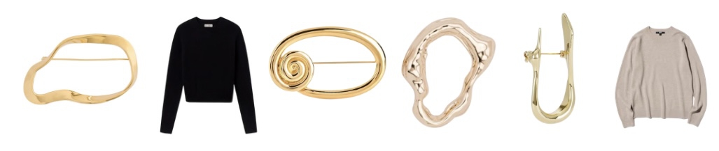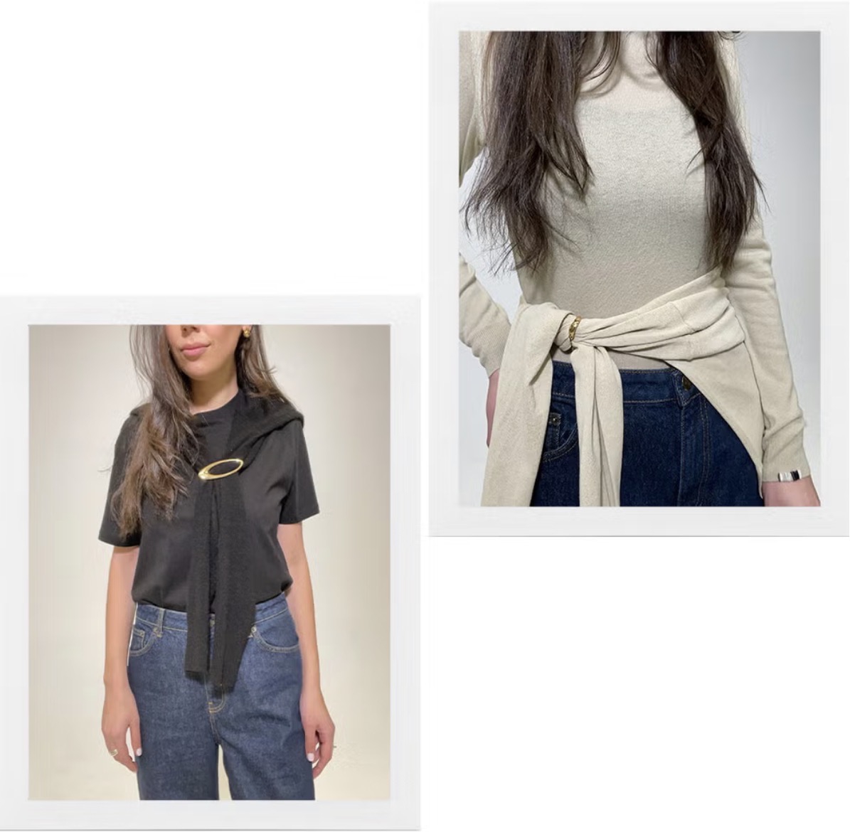 Bazaar selalu menambahkan sedikit daya tarik visual pada pakaian saya dengan mengikat sweater di leher atau di pinggang. Menambahkan bros membuat tampilannya terasa lebih disengaja. Pilih pin horizontal dengan bagian tengah terbuka untuk mengikat kedua lengan sweater di sekitar leher, sehingga memberi elemen sculptural pada tampilan yang sederhana. Atau untuk sweater yang diikat di pinggang, cobalah bros berbentuk loop untuk memecah tampilan monokrom.