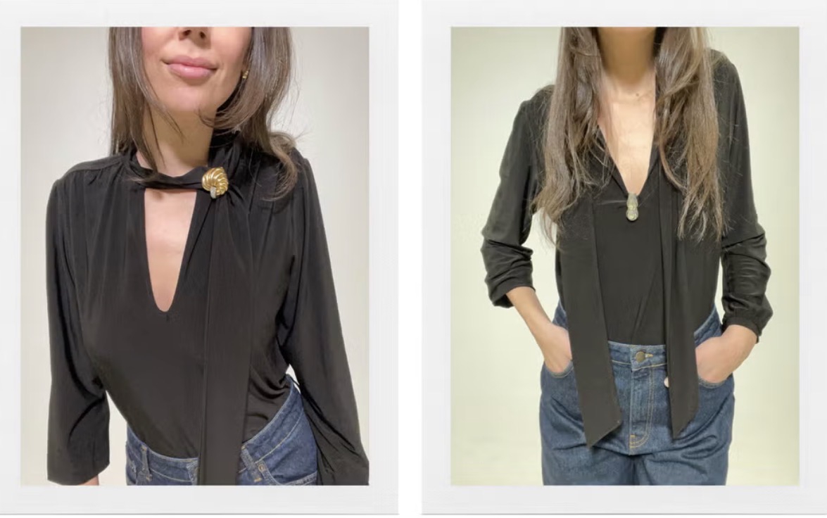 - Untuk menonjolkan bahu atau dada: Sematkan bros pada strap bagian depan, sehingga kain terjepit dan membentuk ulang garis leher atasan.
