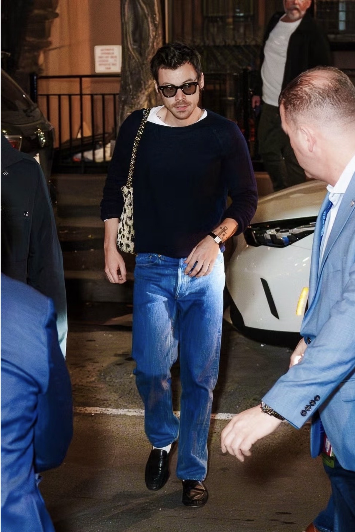 Di bagian atas, Harry melapisi sweater navy di atas kaus putih, lalu mengenakan kacamata hitam dari Jacques Marie Mage. Untuk bagian lain dari tampilannya, ia menjaga semuanya tetap simpel dengan celana jeans biru medium-wash yang sering ia pilih dalam versi vintage dari Levi’s, serta loafers hitam berkerut yang dikenakan bersama kaus kaki putih.