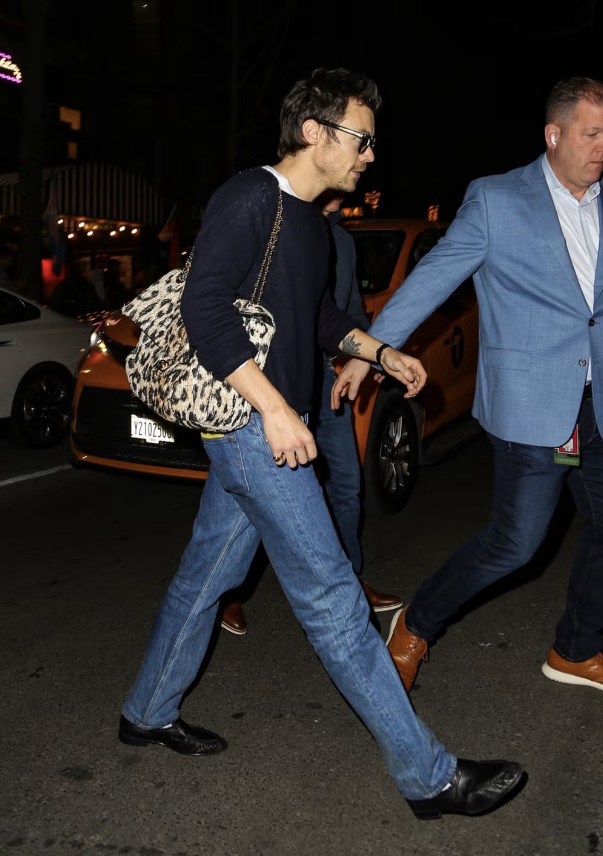 Saat motif animal print terus merajalela di runway maupun di jalanan kota, Harry menampilkan tren tersebut melalui tas flap bermotif leopard yang terinspirasi gaya Fauvist. Tas itu menggantung di bahunya dengan dua rantai emas tipis yang berkilau.