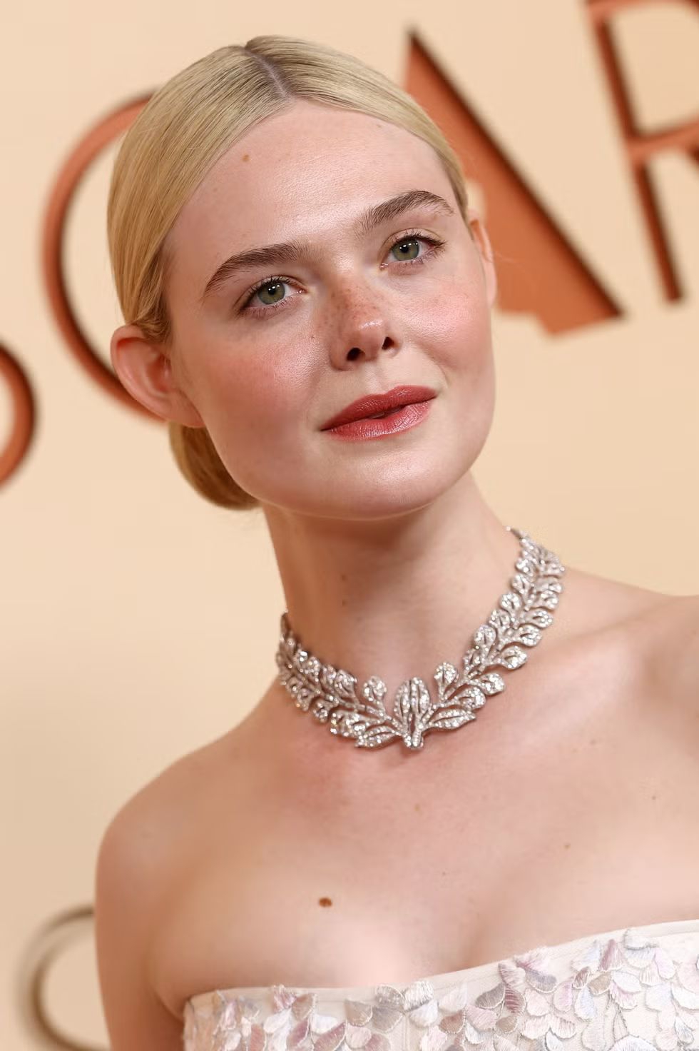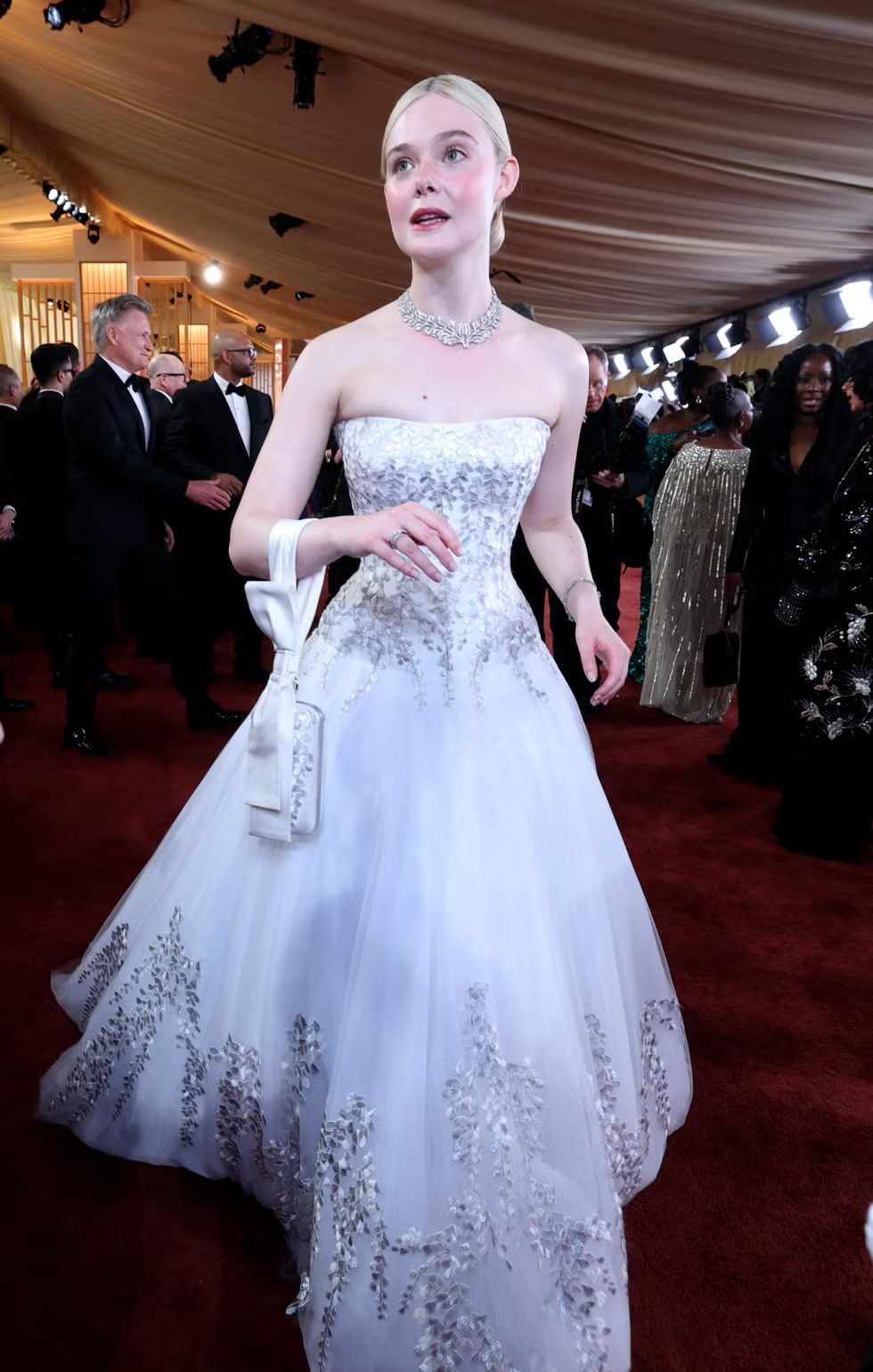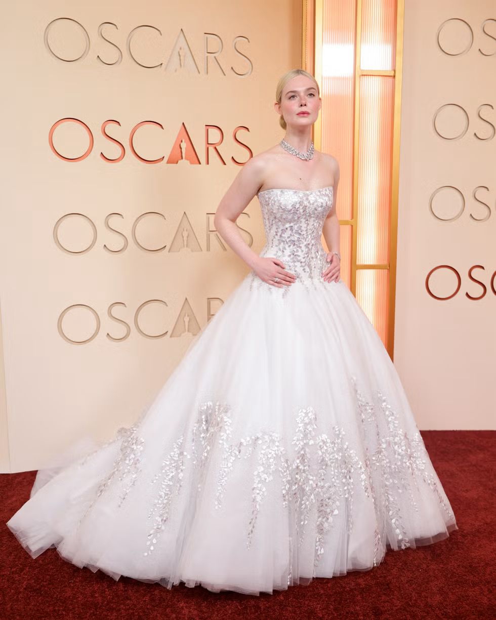 Kalung "Wisteria" yang dikenakan Elle awalnya adalah sepasang bros berlian yang dibuat pada tahun 1903. Setelah memilih perhiasan antik tersebut untuk Oscar, Elle mulai bekerja sama dengan Sarah Burton dalam mendesain gaunnya, gaun tulle putih tanpa tali bahu, yang menampilkan sulaman tangan bunga wisteria dengan teknik satin di seluruh bagian korset dan rok yang mengembang.