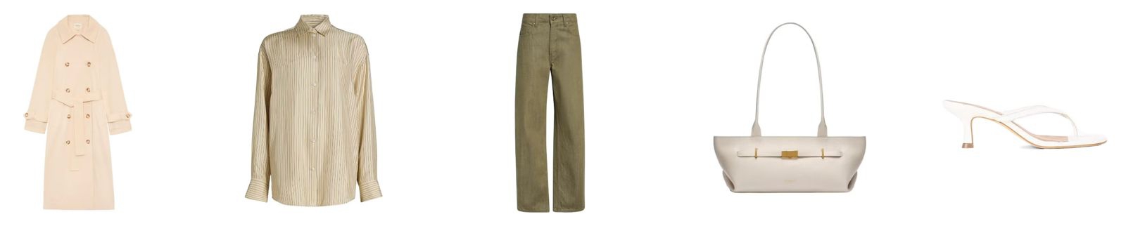 Kiri ke kanan: Mantel Pierce/Kemeja Garis Oversize/Jeans Barrel Low-Rise Rider/Tas Bahu New York/Sandal Jepit Kulit Freja