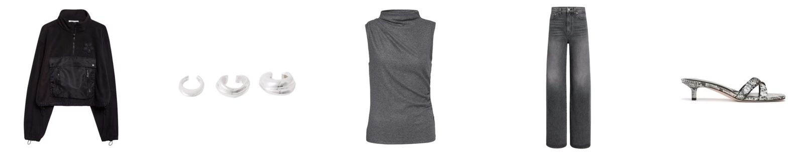 Kiri ke kanan: Anorak Bastian/Ear Cuff Lapis Perak/Atasan Draped Mylie/Jeans Wide-Leg Dane/Sandal Kitten Heel Shiloh