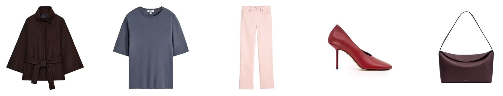 Kiri ke kanan: Cape Coat Wol Pendek/Kaos Sutra Fluid/Jeans Lurus Panjang/Sepatu Pumps Kulit Sierra/Tas Bahu Forma