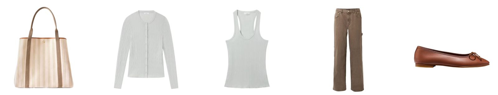 Kiri ke kanan: Tas Tote Kanvas Besar Traversée/Cardigan Katun Fisher/Tank Top Katun Iris/Jeans Tapered Mid-Rise/Sepatu Flat Fonteyn